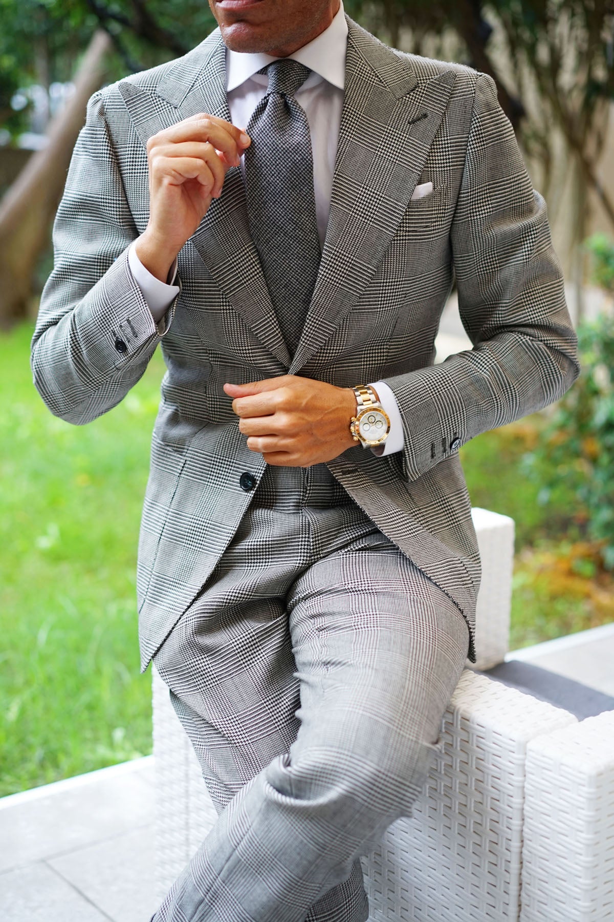 In the symphony of wedding attire, the crescendo of elegance emerges in the delicate interplay between your tie and pocket square. As these final touches harmonise, it's a moment to pause and revel in the meticulous curation of your ensemble. Each pocket square fold and every subtle dimple in the tie weave together to create a visual composition of thoughtful consideration and unadulterated refinement. It's a testament to the artistry of your style, the culmination of choices made with precision, and the visual embodiment of your unique sartorial identity.