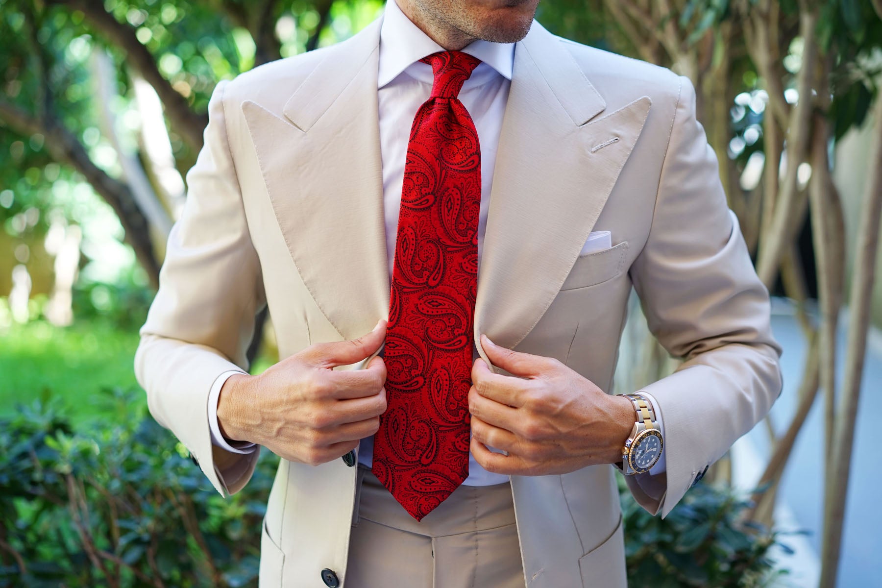 Texture, a silent but potent storyteller in the world of fashion, can imbue your red tie with distinct character and resonance. The smooth, silky embrace of satin speaks eloquently of refined elegance, making it the ideal companion for those time-honored, formal wedding ceremonies where tradition and sophistication hold sway. Conversely, when you opt for a woolen or knitted tie, you inject a touch of rugged texture into your attire, weaving an approachable charm into the fabric of your ensemble. This material choice has the remarkable ability to transform the narrative of your outfit, shifting it effortlessly from the realm of 'formally classic' to the inviting terrain of 'charmingly laid-back.' Thus, in the intricate tapestry of style, textures become the threads that weave stories, allowing your red tie to communicate not just color but also character.