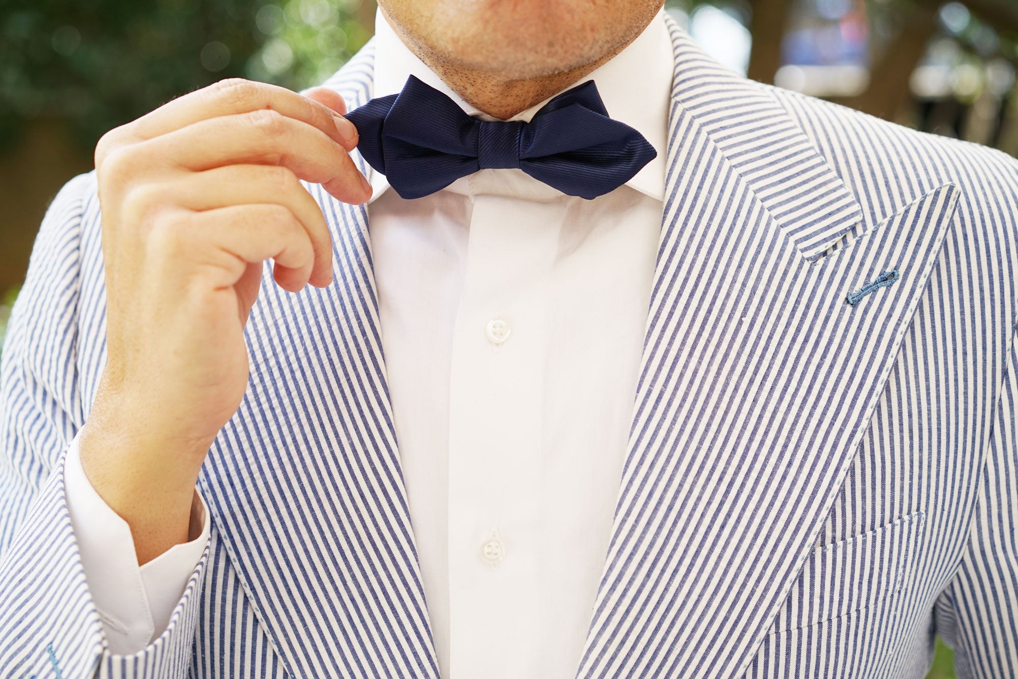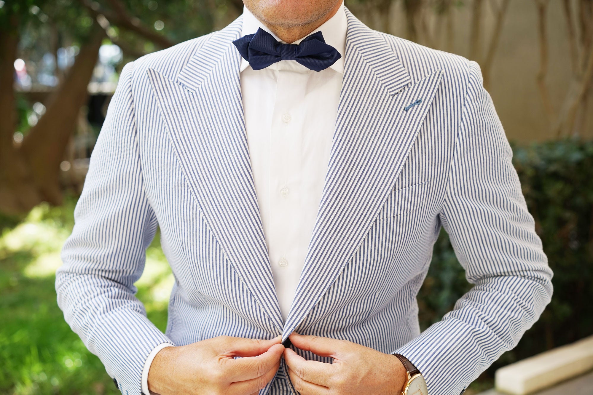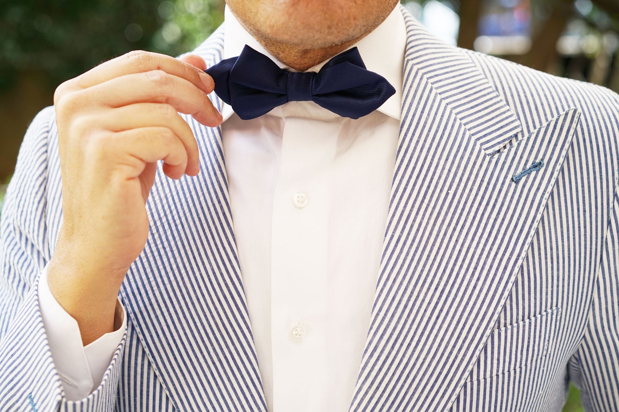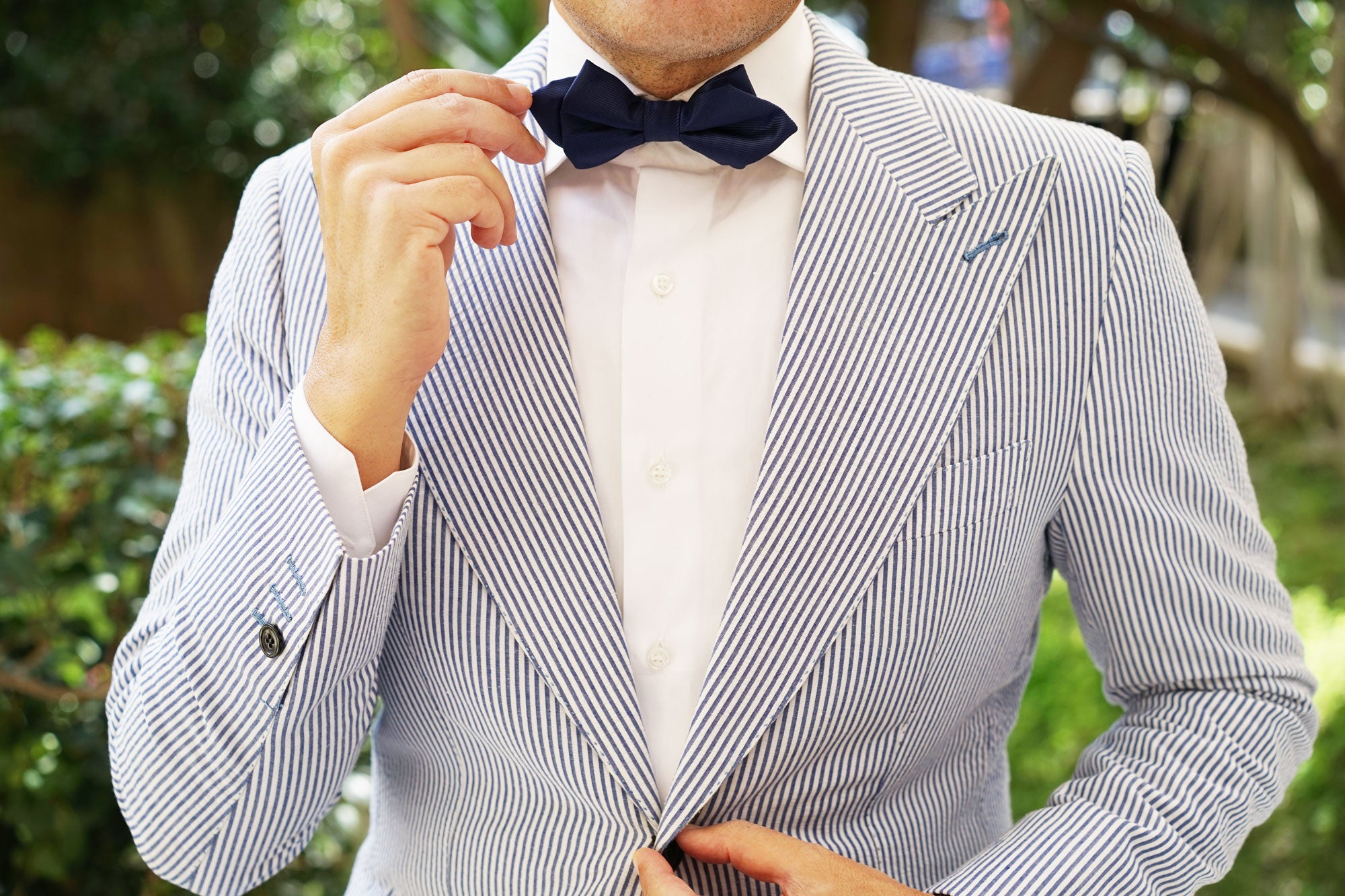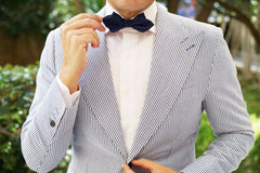 Gift your suits a formal flourish with OTAA's exquisite Navy Blue Line Diamond Bow Tie. Making a formal statement with considered suits, the Navy Blue Line Diamond Bow Tie will be your most reliable ticket to get you dressed to the nines! Because of its sheen, navy blue fabric, this diamond bowtie is a nautical masterpiece that will reward your wardrobe a versatile advantage. Let the intricate line-backing enhance the textural outlook of your suits and bring about a luxurious standpoint. This Navy Blue Line Diamond Bow Tie Diamond Bow Tie has been stitched by hand and tailored from a plush fabric to ensure you comfort and style every time you head out the door. Designed exclusively by the Brothers at OTAA.
