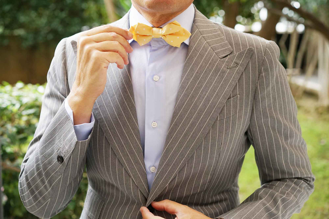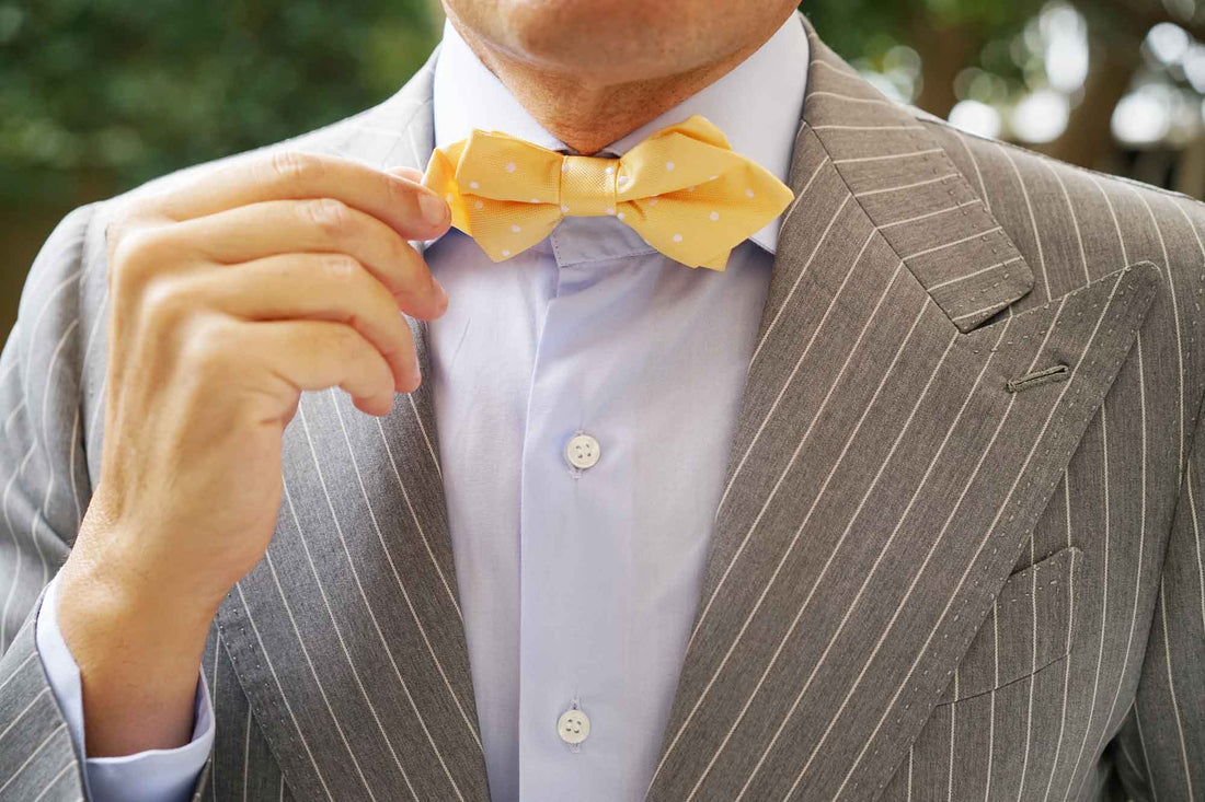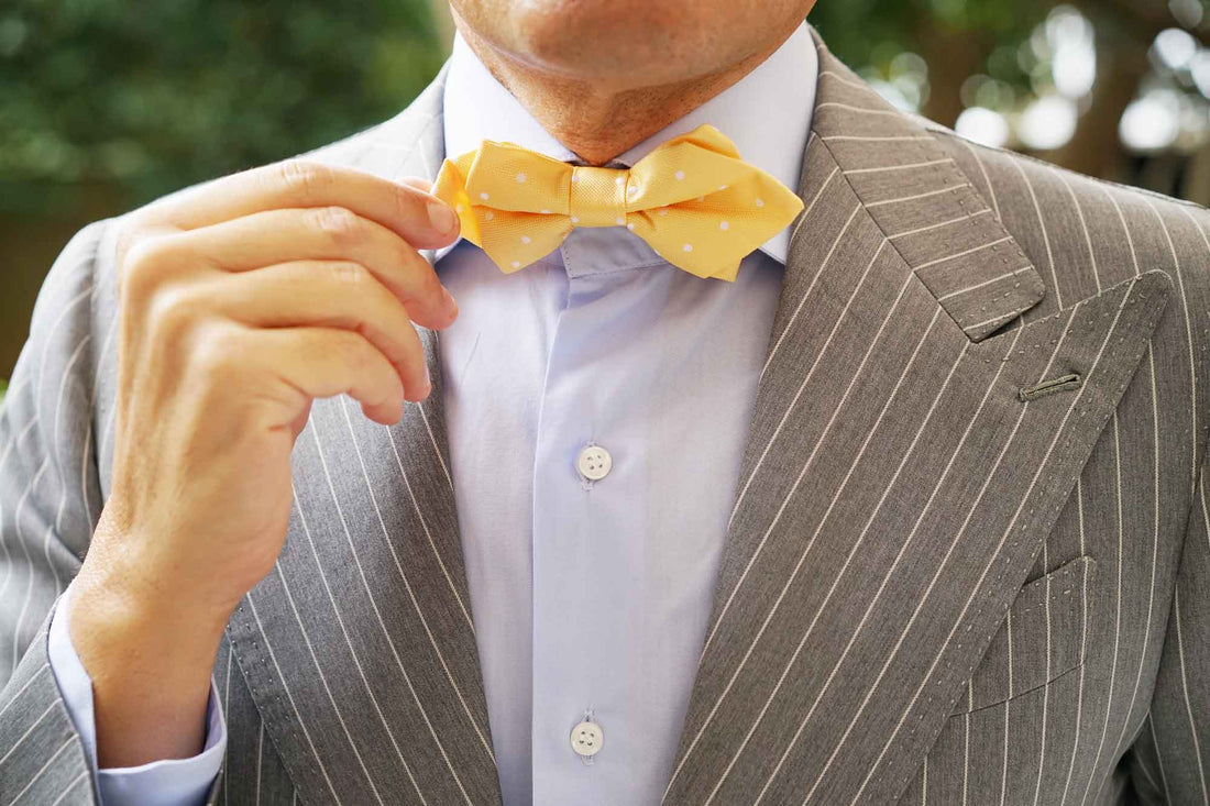 The Yellow with White Polka Dots Diamond Bow Tie will get you suited up for elegance. The pastel yellow hue of this design is its trademark and will uplift your wardrobe with an ebullient perspective. Charmingly intercepted by hand-embroidered polka dots, this Yellow with White Polka Dots Diamond Bow Tie offers an aptitude for playfulness that will enliven your drab work-week wardrobe. From its hand-stitching process to its meticulous tailoring, this diamond bow tie offers excellence in detail that can be observed by the naked eye. Let it give you point of confidence in the boardroom and a formal polish at weddings. Designed exclusively by the Brothers at OTAA.