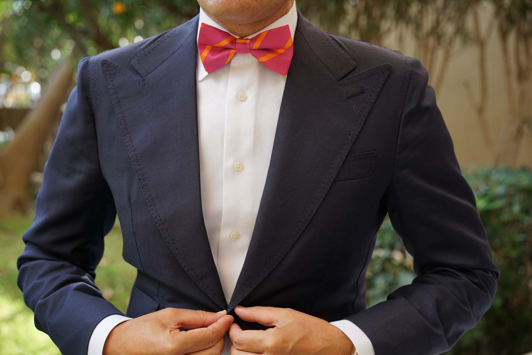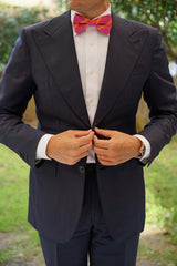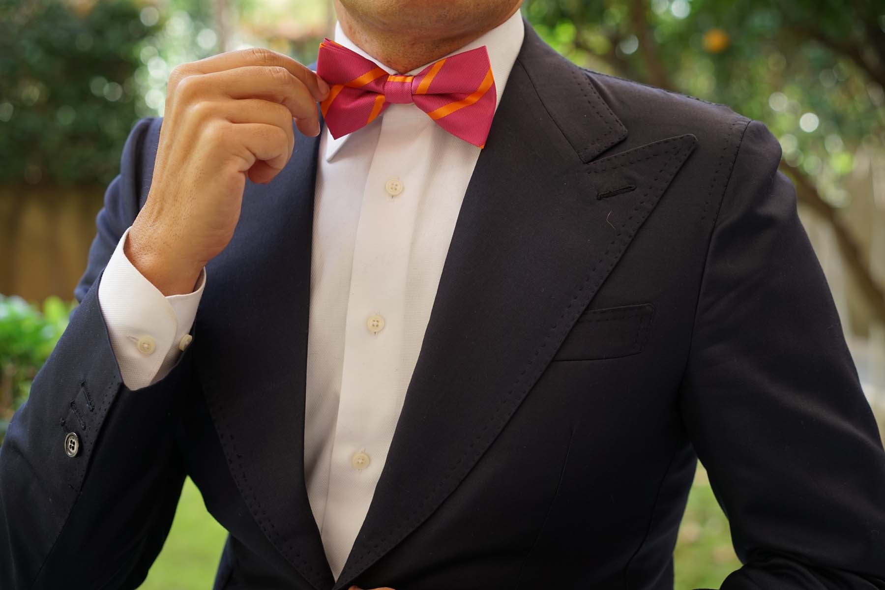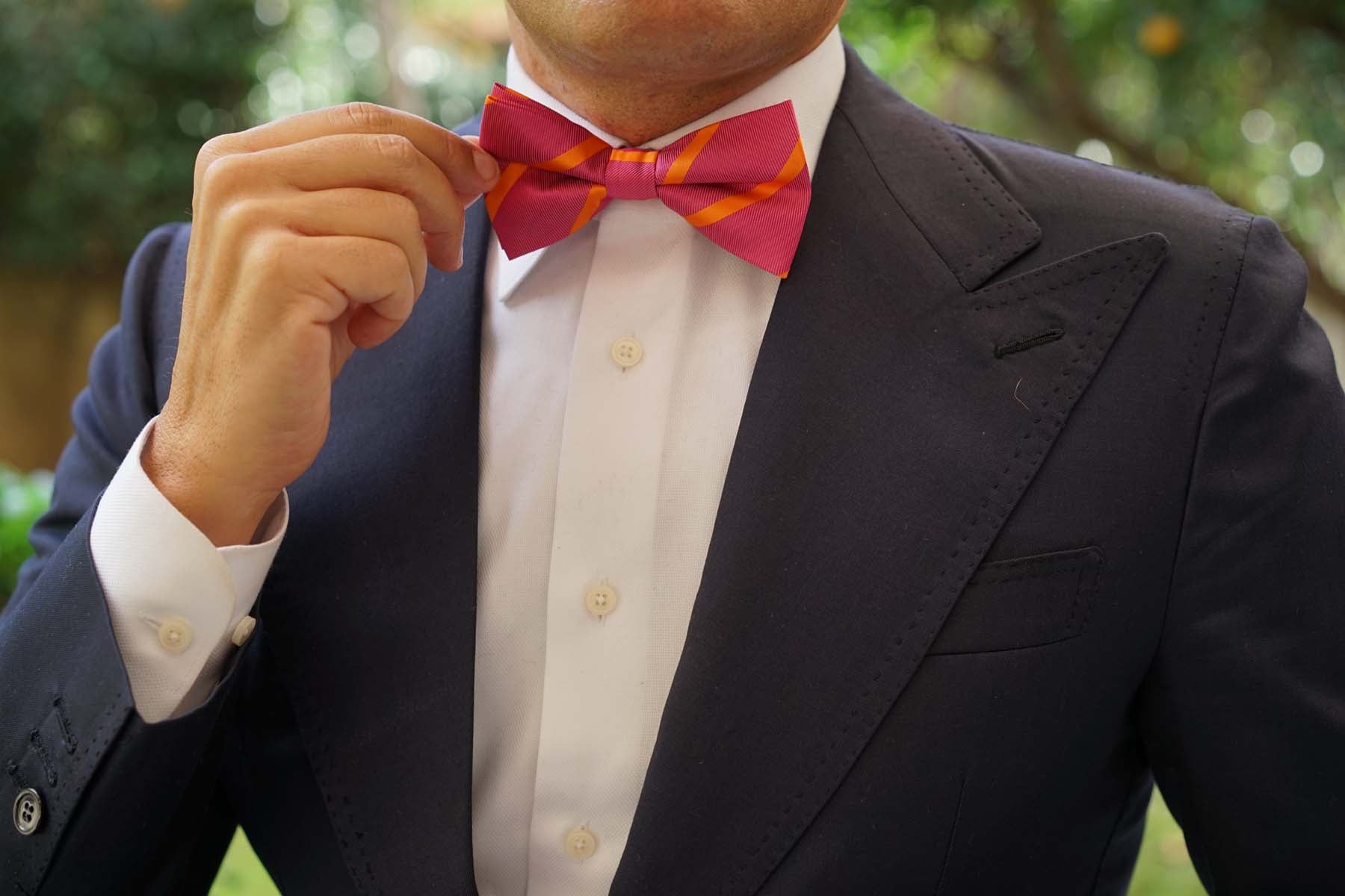 True to OTAA's classic flamboyant aesthetic, the multi-coloured stripe of this Hot Pink with Orange Diagonal Bow Tie exudes a preppy polish. Vibrant pops of pink and yellow are the perfect way to bring a cheerful tone to laid-back looks. Don't worry about it feeling too bold - dress it down with a slim fit button-down collared shirt for added elegance.