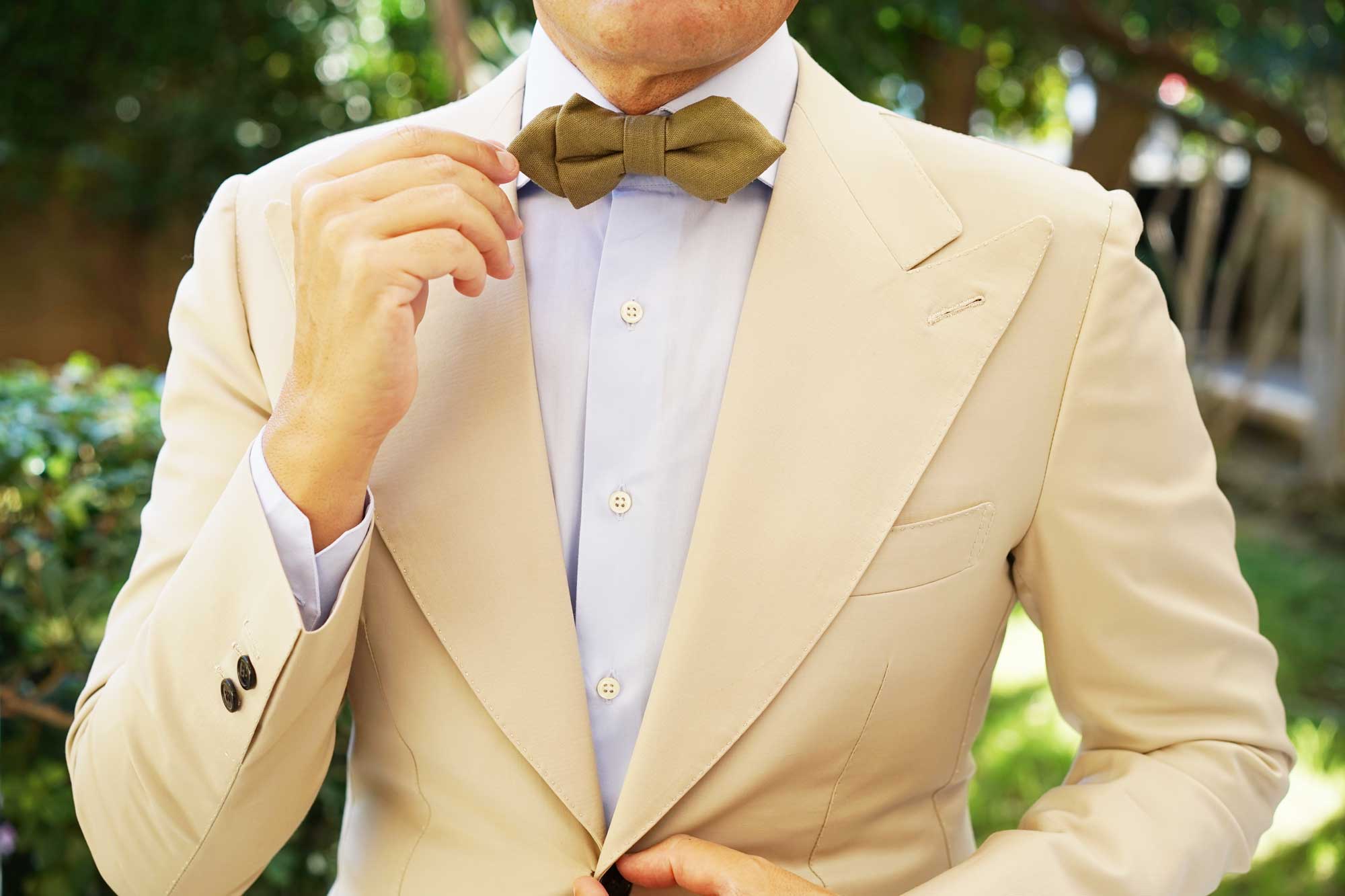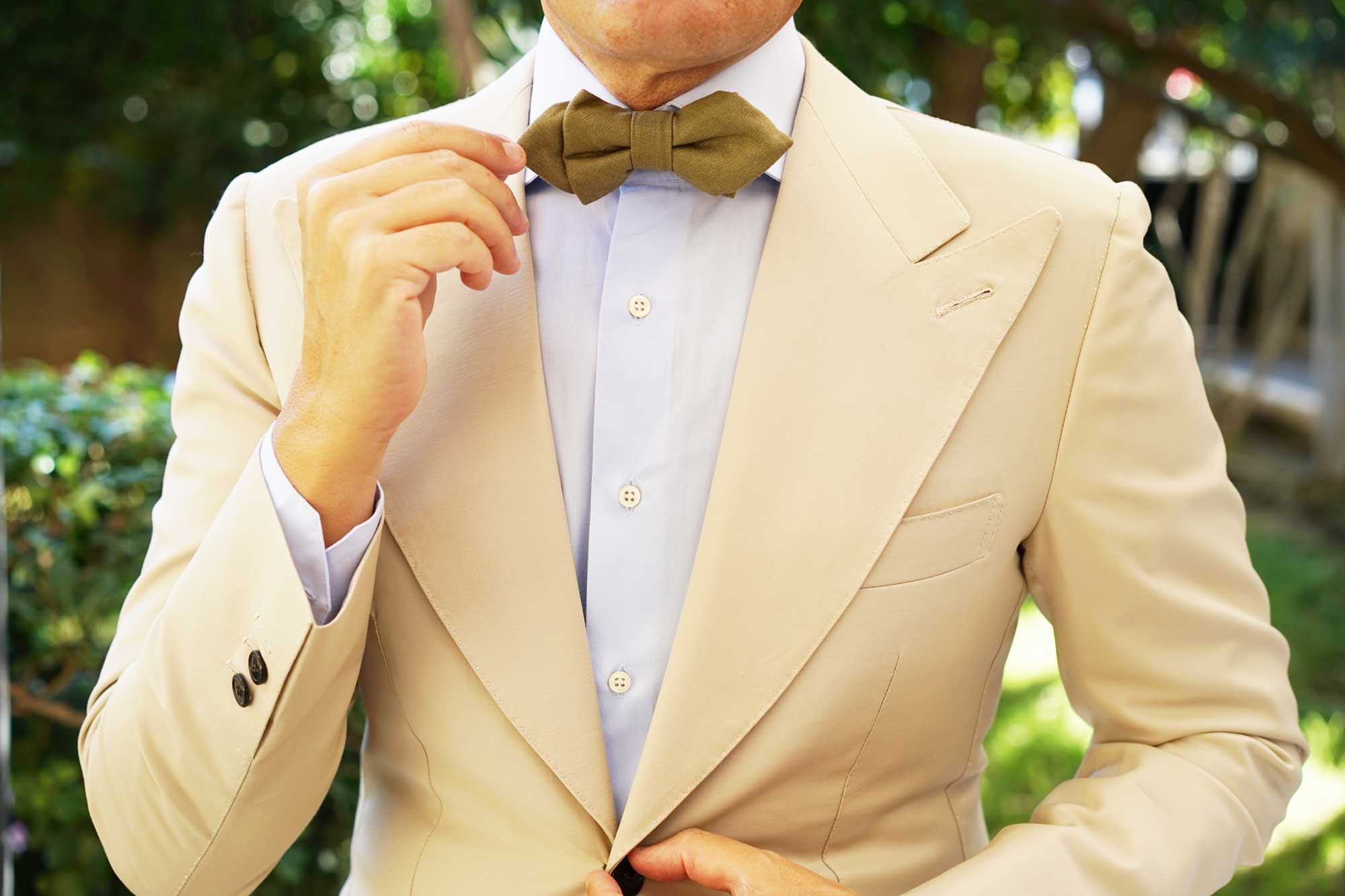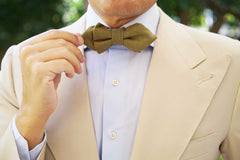 This Dry Green Khaki Linen Diamond Bowtie has historical pedigree. In 1846, khaki was conceptualised as a military uniform by Sir Harry Lumsden who observed that white cotton uniforms made his army an obvious target. Since then, khaki has long drawn associations with safaris, expedition and British India, and in the 21st century; it's become a prized fabric in the world of high-fashion. This khaki diamond bowtie by OTAA is a divine tribute.