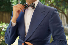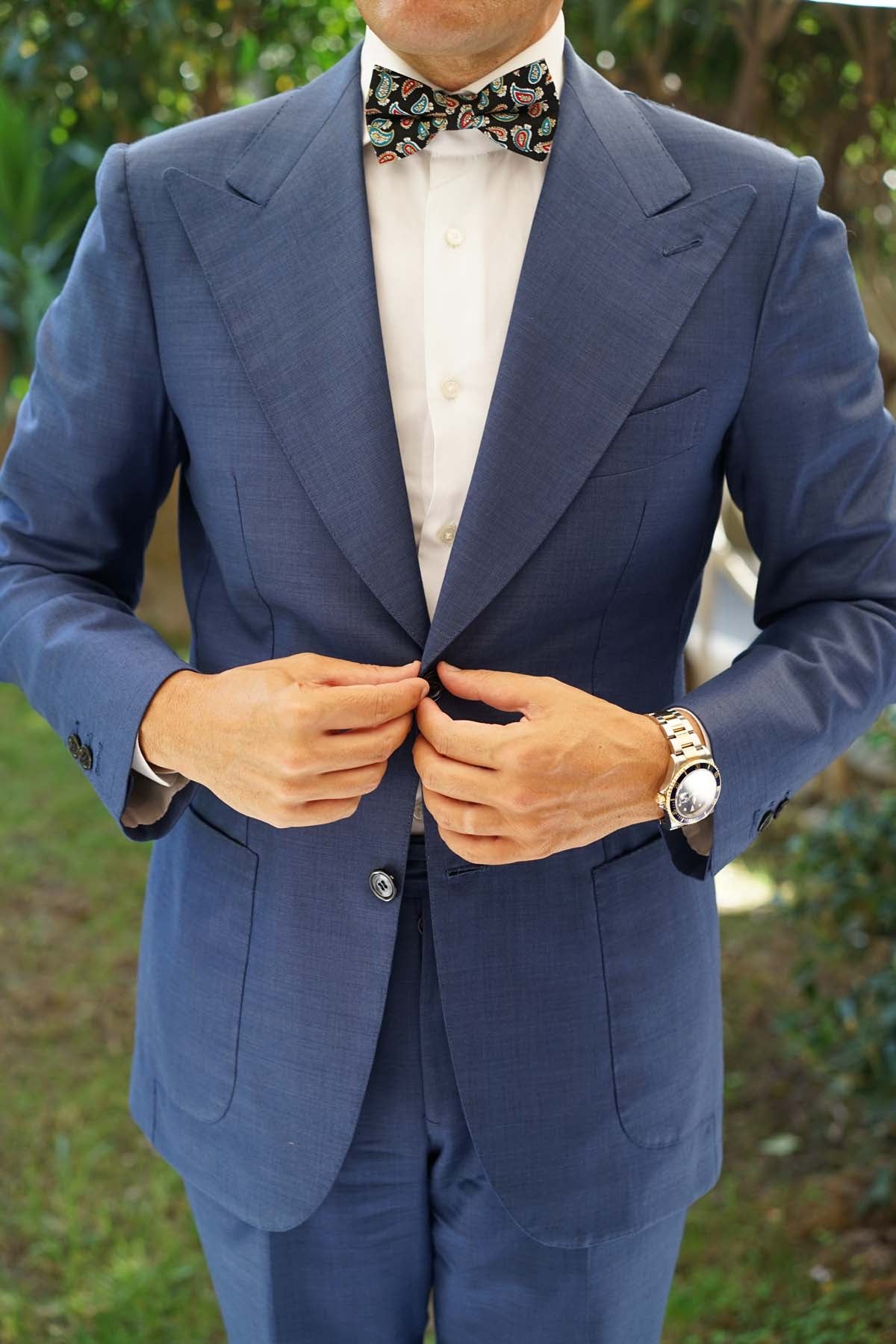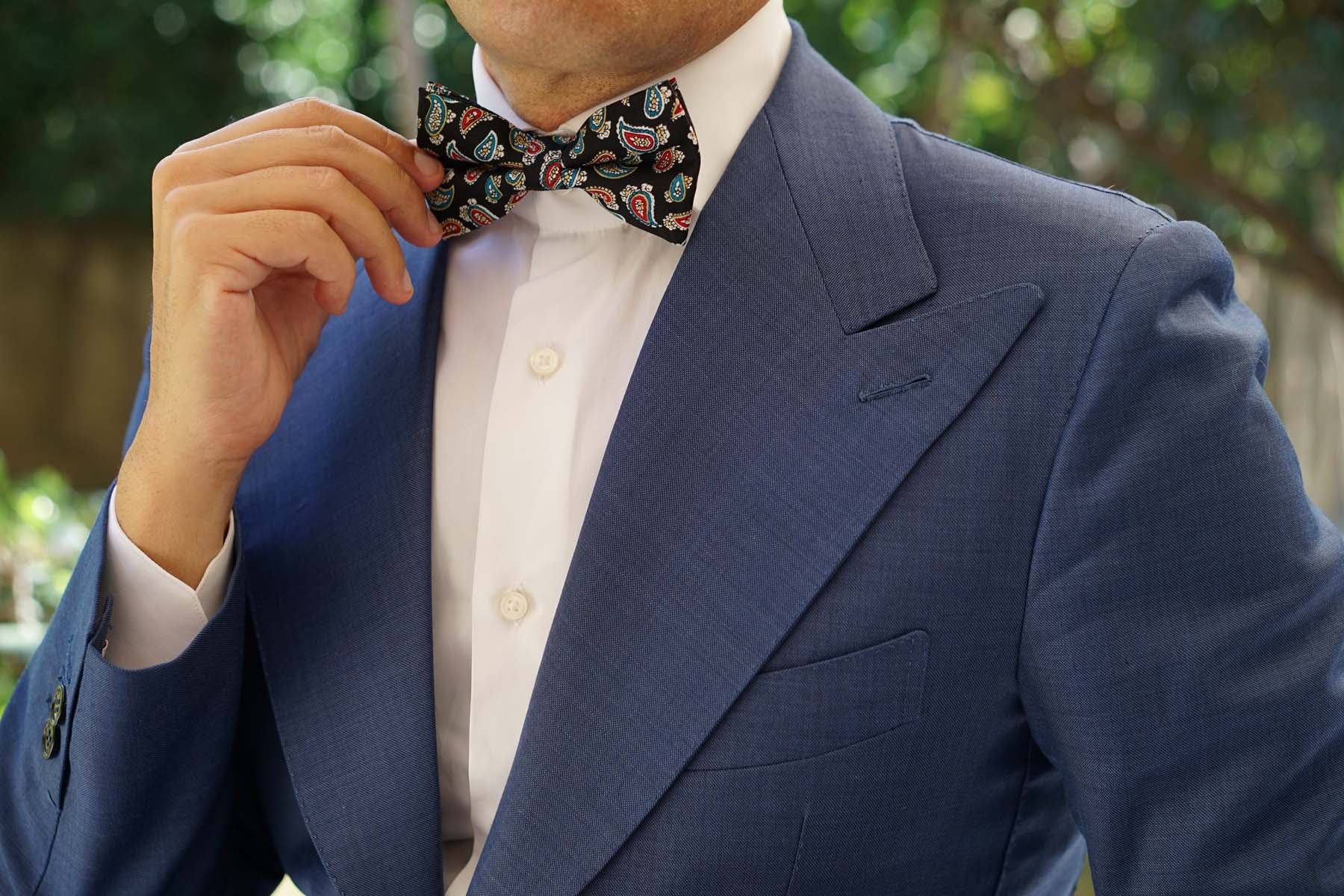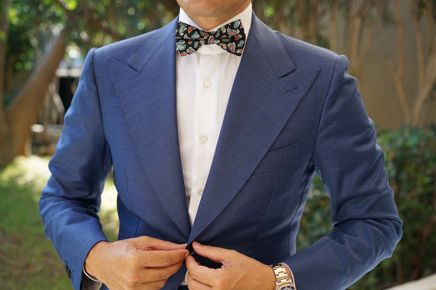 Hand-sewn and tailored to perfection, this handsome pre-tied bowtie emanates a high-quality presence as part of tailored ensembles. With a decadent black palette and ebullient blue, white and yellow features, this pre-tied bowtie showcases a paisley teardrop pattern with subtle floral motifs. Designed exclusively by the Brothers at OTAA, we present you with the Black Twisted Teardrop Paisley Bow Tie. Recommended by Mr Bond himself (the Italian consultant).