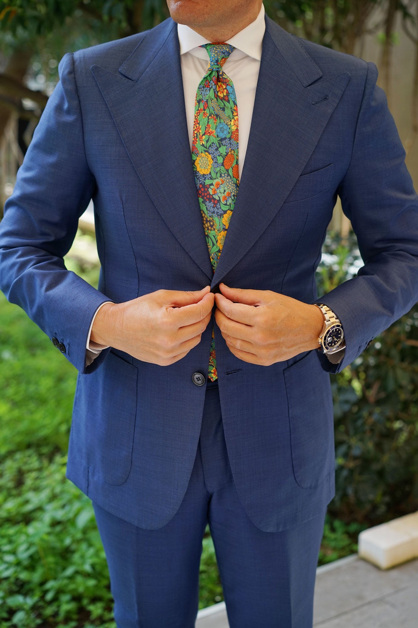 The Brothers at OTAA strive to constantly come up with unique designs, and this floral tie is a dazzling example. Vibrantly decorated with a medley of navy blue, light blue, green, red, yellow, orange and purple hues, this Amazonian Jungle Floral Necktie makes a vivacious statement. Crafted by hand and tailored from a luxurious cotton blend, the Amazonian Jungle Floral Tie demonstrates OTAA’s high-quality philosophy.