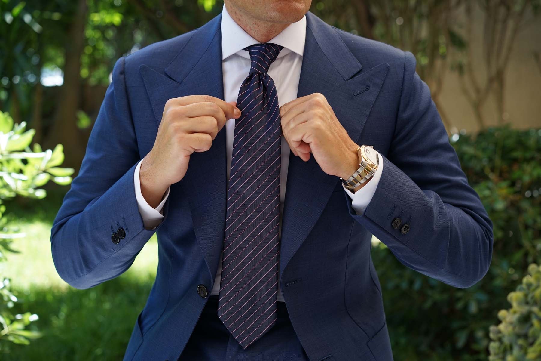 The Pink Striped Navy Blue Herringbone Necktie will lend a dash of the refined and a sprinkle of sumptuousness to your outfit of choice. Crafted with the care synonymous with the OTAA craft house, this epic treasure will lift your entire ensemble to towering new heights.