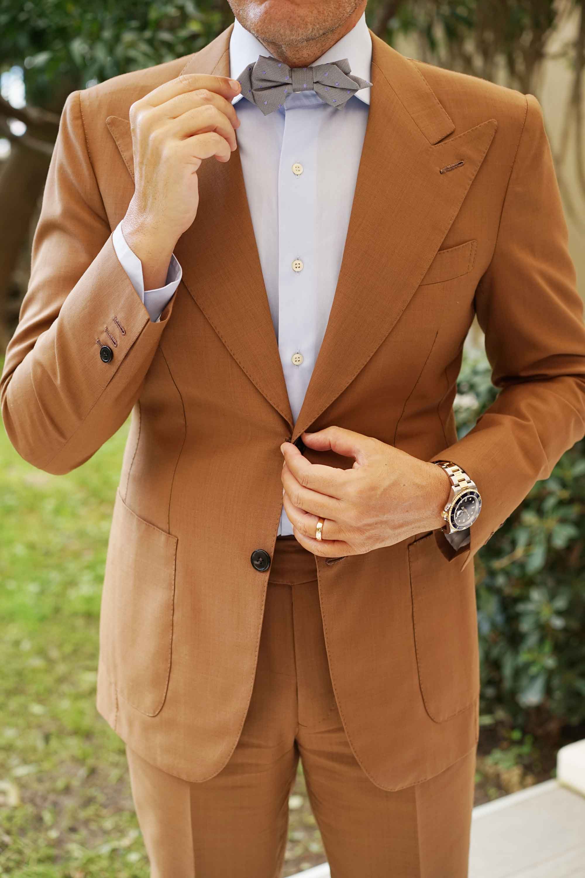 Suit up to elegant proportions with the masterful details of OTAA's Grey with Lavender Purple Polka Dots Diamond Bow Tie. Light grey boasts a versatile palette that's perfectly complemented by the hand-embroidered lavender accents that are embellished throughout. Superbly delicate and incredibly modern; the Grey with Lavender Purple Polka Dots Diamond Bow Tie boasts a hand-stitched design with a textured, tailored fabric. Let its clean details and impeccable palette gift your suits a wealth of luxury. Designed exclusively by the brothers at OTAA.