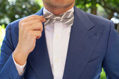 Every distinguished gentleman should be in possession of at least one striped bow tie bowtie, and this in-house design is a flawless option. Featuring a faded black and white diagonal striped pattern, this pre-tied bowtie will imbue your formal tailoring with a sophisticated edge. Crafted by hand and tailored with elegance, this Adana Black Chalk Stripe Linen Bow Tie is a sophisticated staple. Designed exclusively by the Brothers at OTAA.