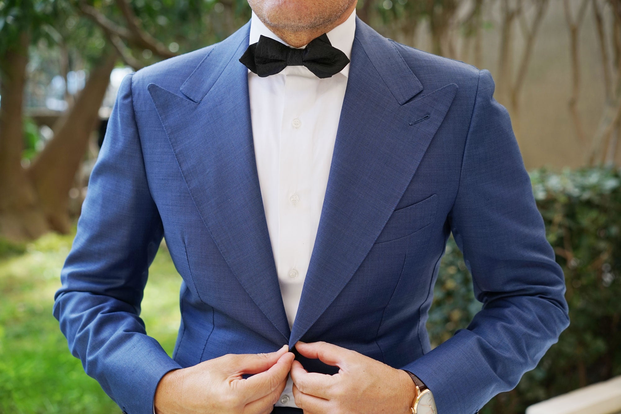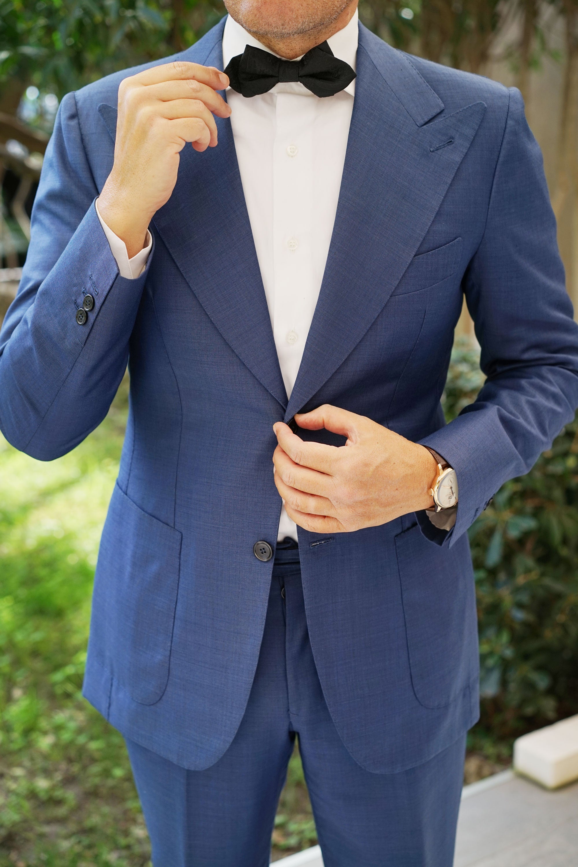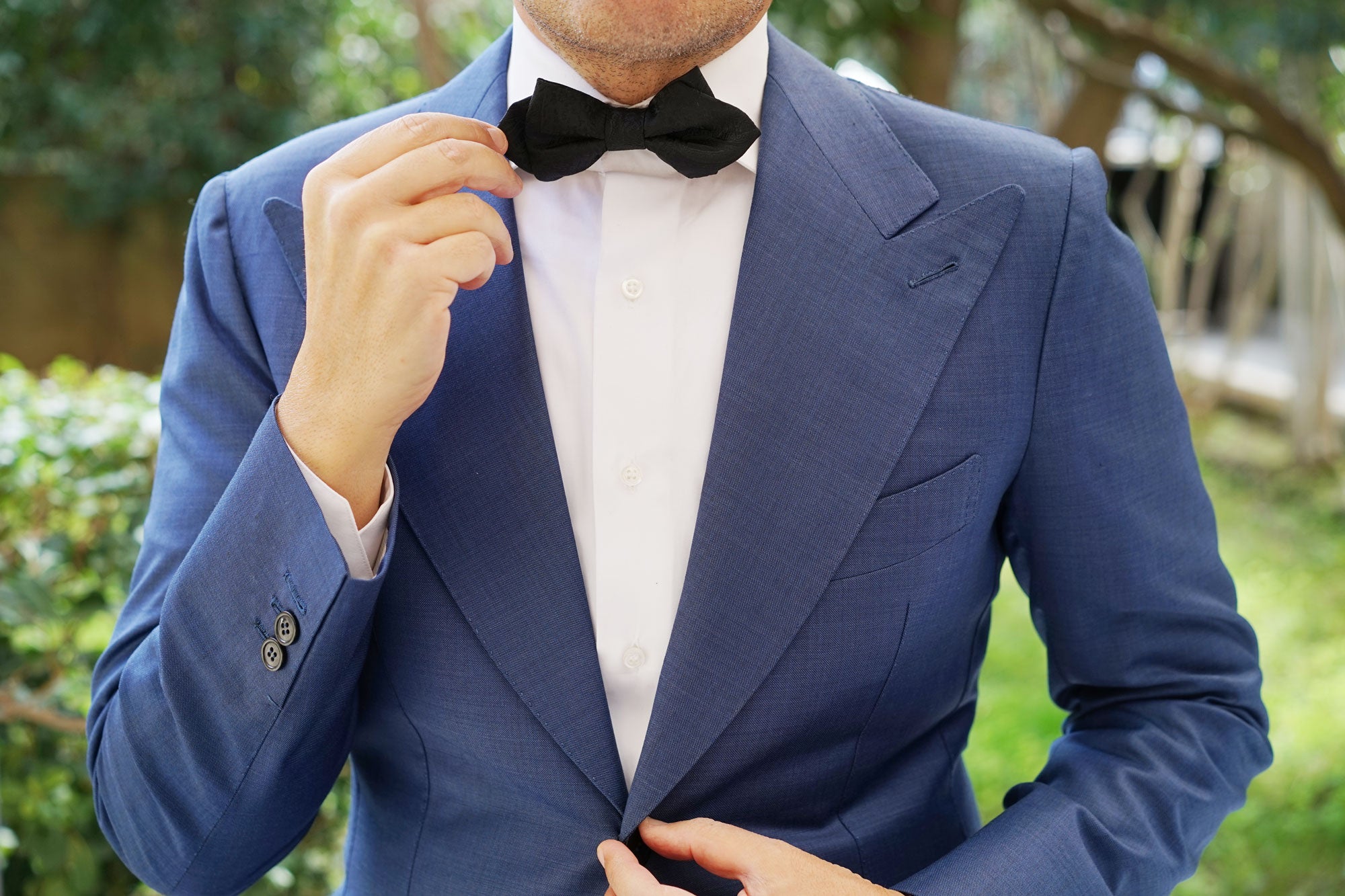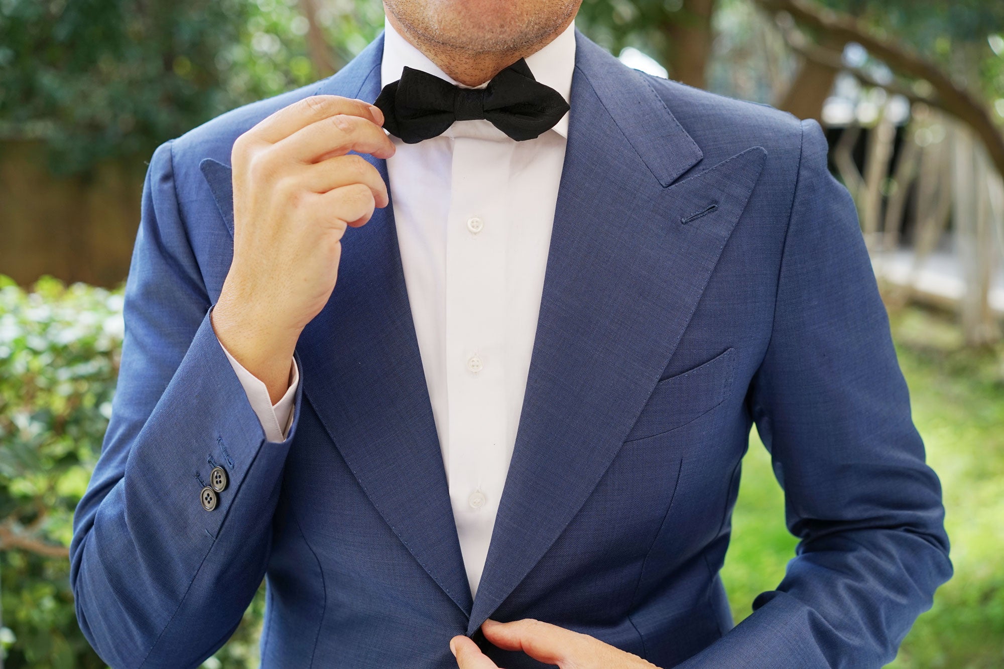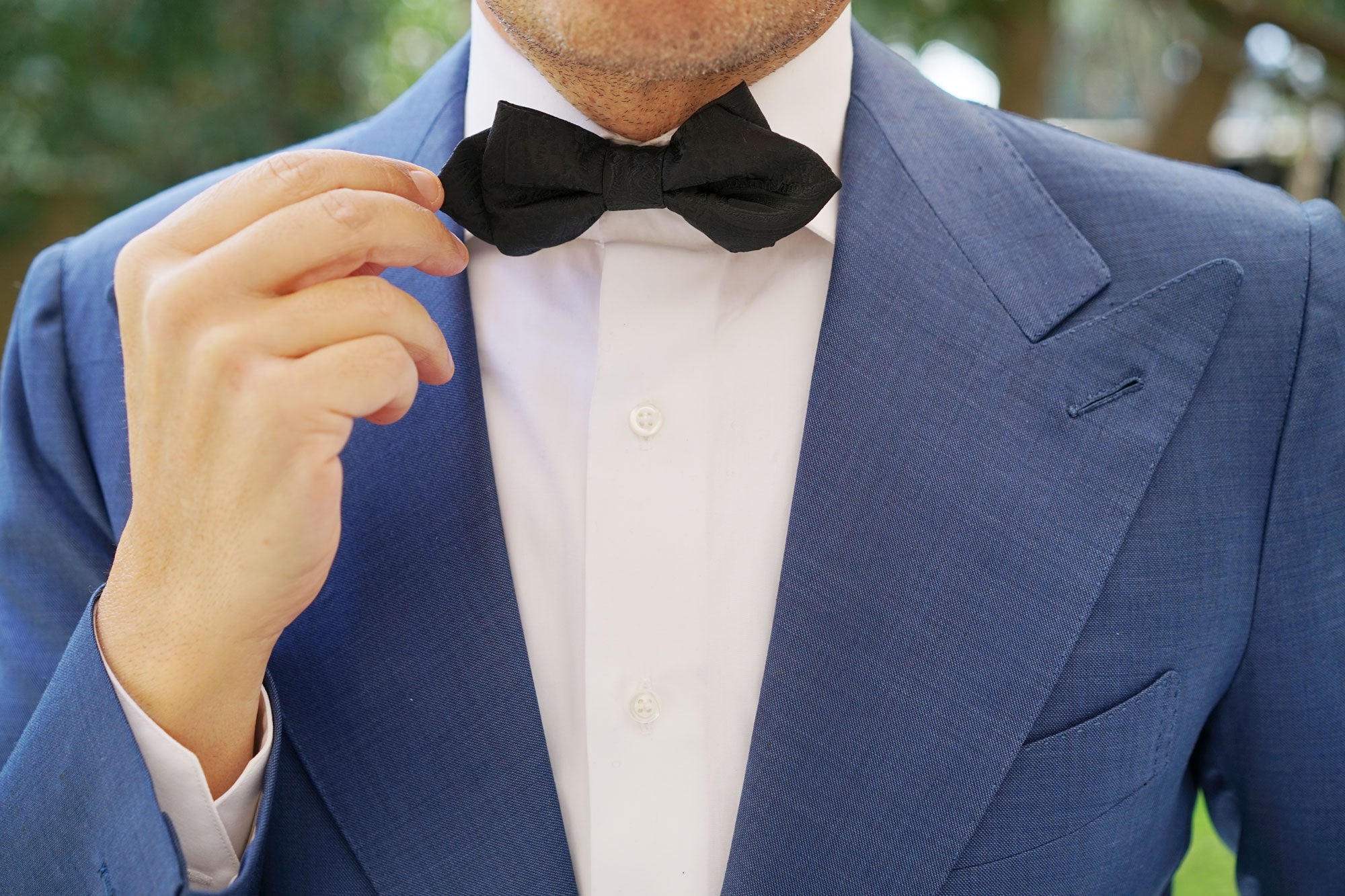 Dive into the world of luxury with OTAA's Paisley Midnight Black Diamond Bow Tie. Imbued with the colour that's most widely associated with sophistication, this diamond bowtie takes a turn on classic black designs by incorporating an intricate paisley motif. Subtly punctuated by hand-embroidered paisley patterns, this Paisley Midnight Black Diamond Bow Tie is one of the most detailed bowties you can possibly buy. Let its plush, hand-tailored fabric and clean lines give you something to feel confident about when you step out the door. Designed exclusively by the Brothers at OTAA.