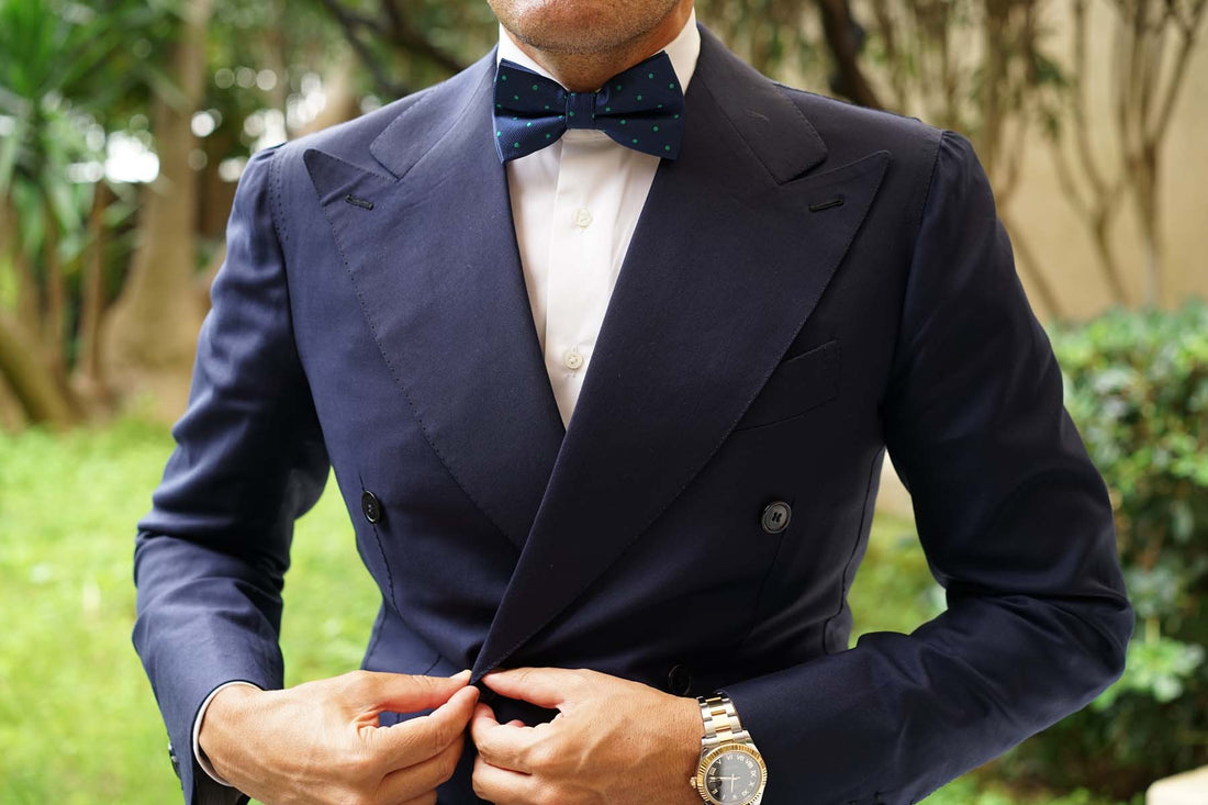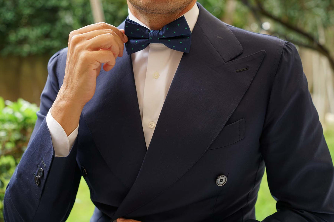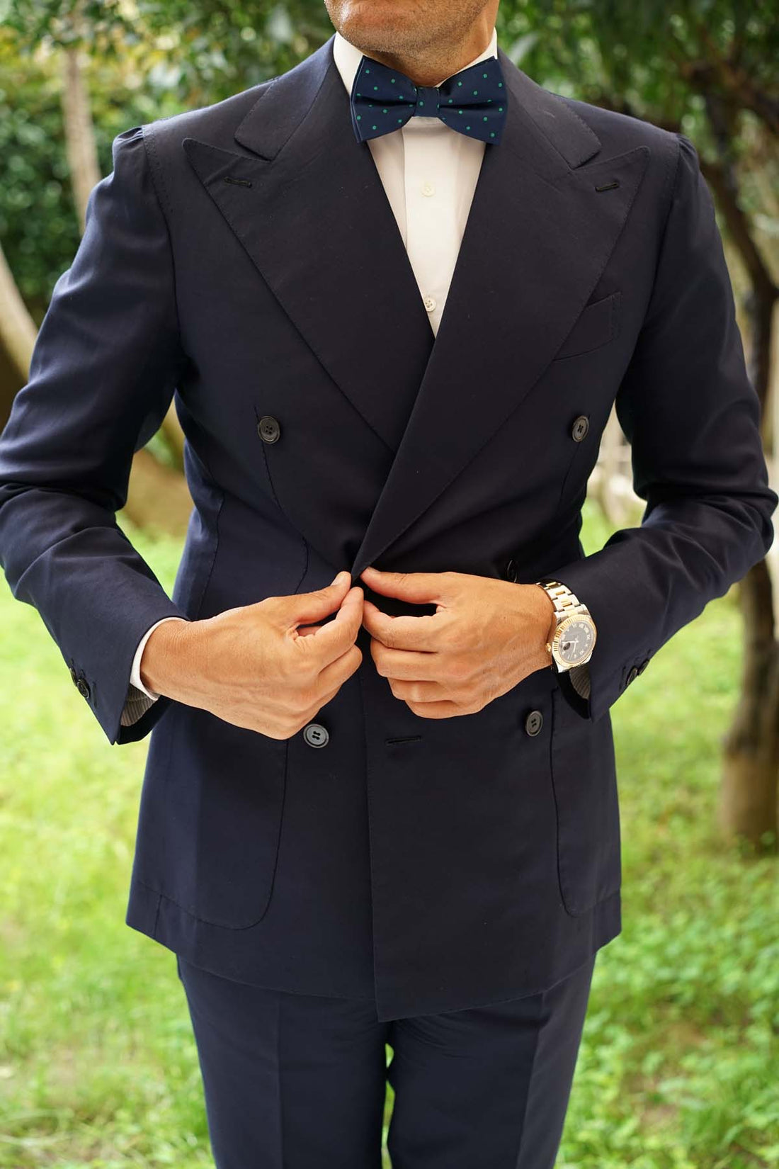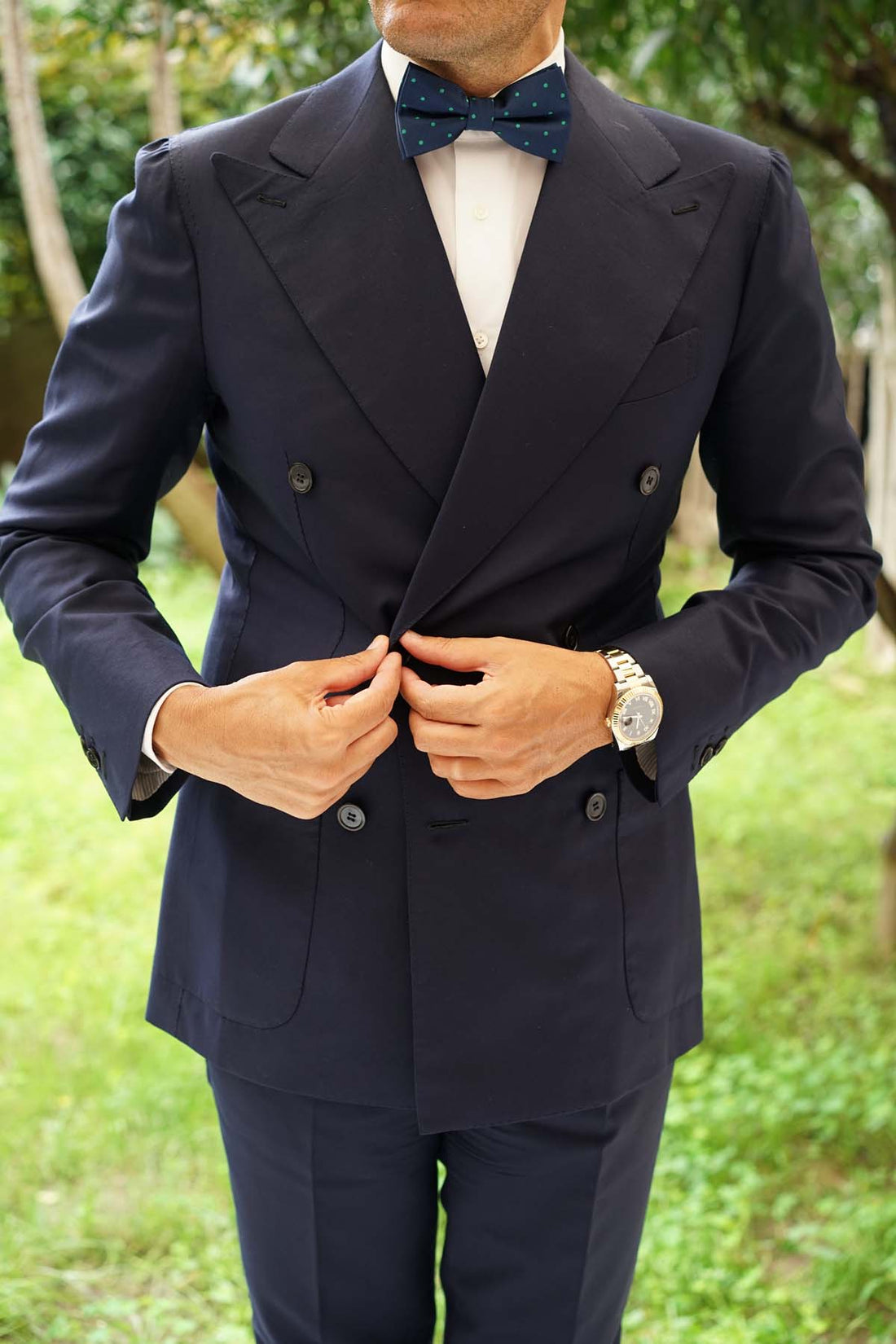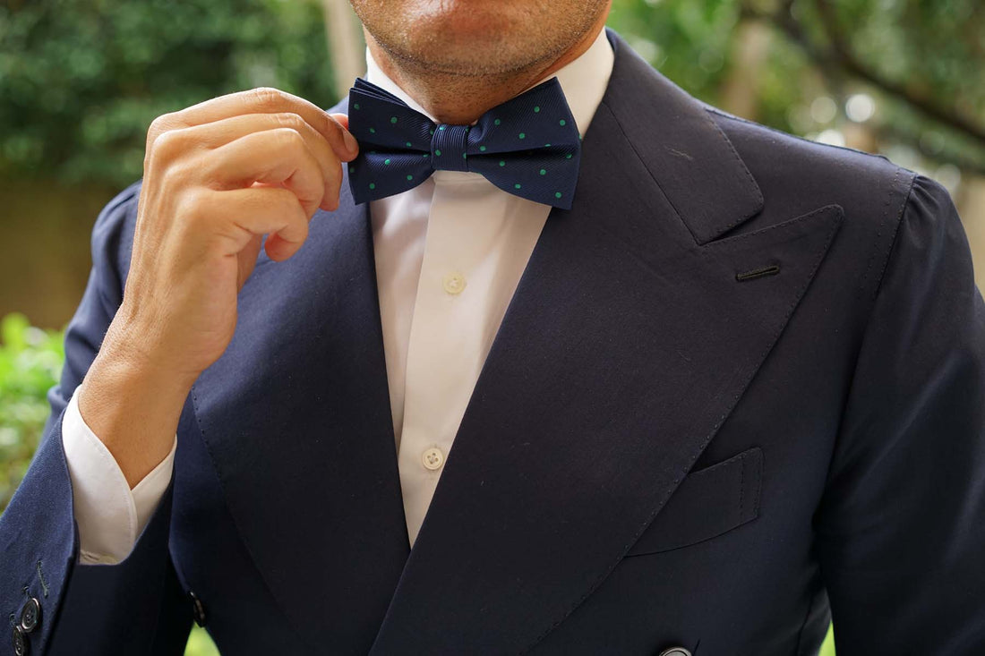 This unsuspecting polka dot tie will give your wardrobe the lift that you've been seeking. The Navy Blue with Green Polka Dots Bow Tie features a playfully scattered array of green dots on a navy background. The lightweight material makes it a great option for every day of the year.