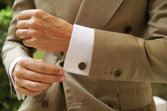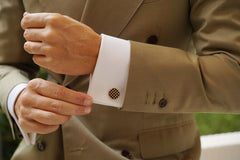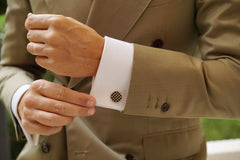 Includes a small cylinder at the back that rotates 90 degrees to hold the cufflink in place