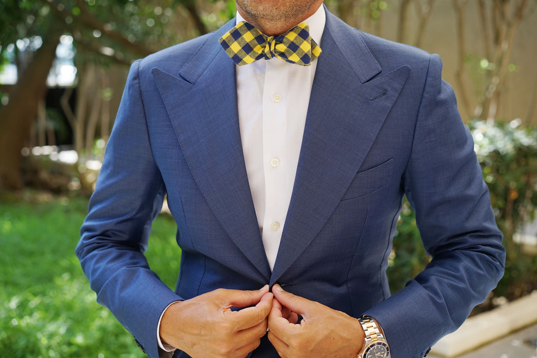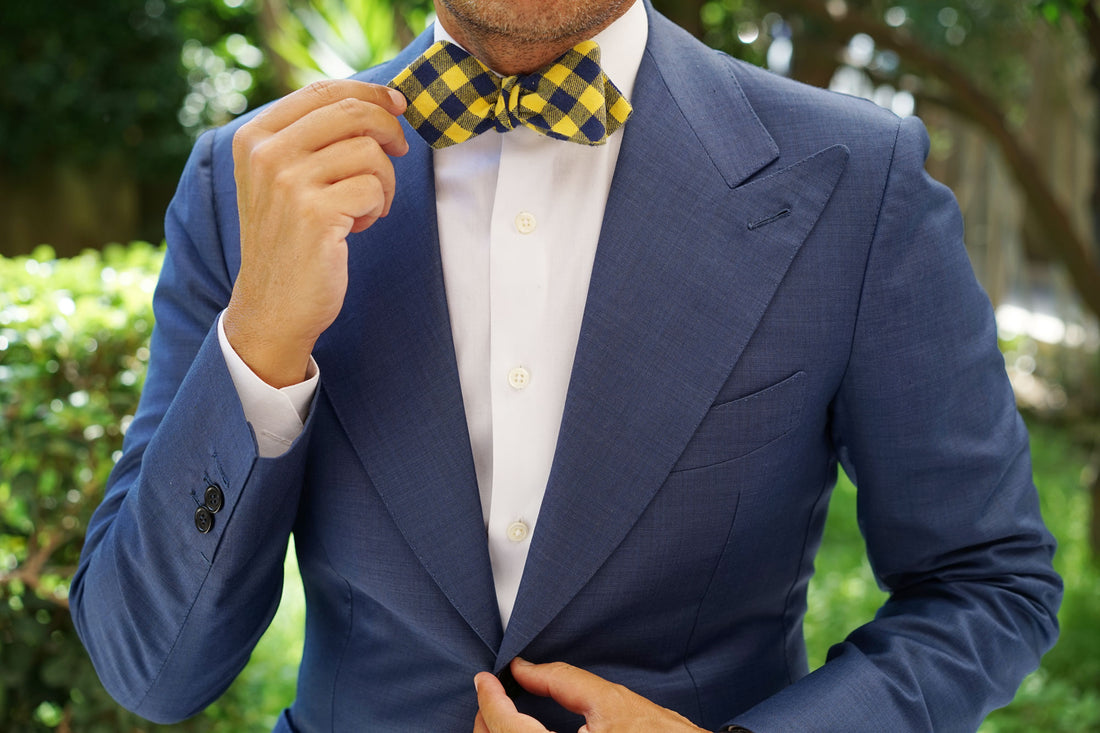 Irresistibly hand-stitched and constructed with elegance, this design provides a top-notch asset to your boardroom looks. The chequer gingham pattern is met with vibrant blue and yellow hues for an artistic outlook. We recommend adding this Bert Yellow Gingham Diamond Untied Bowtie to your boardroom and off-duty looks to channel an accomplished aesthetic. Designed exclusively by the Brothers at OTAA.