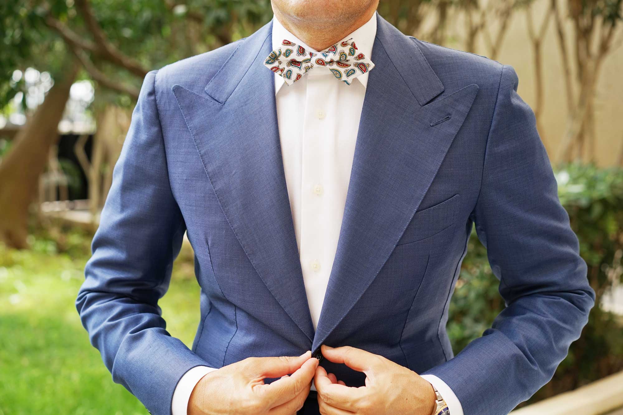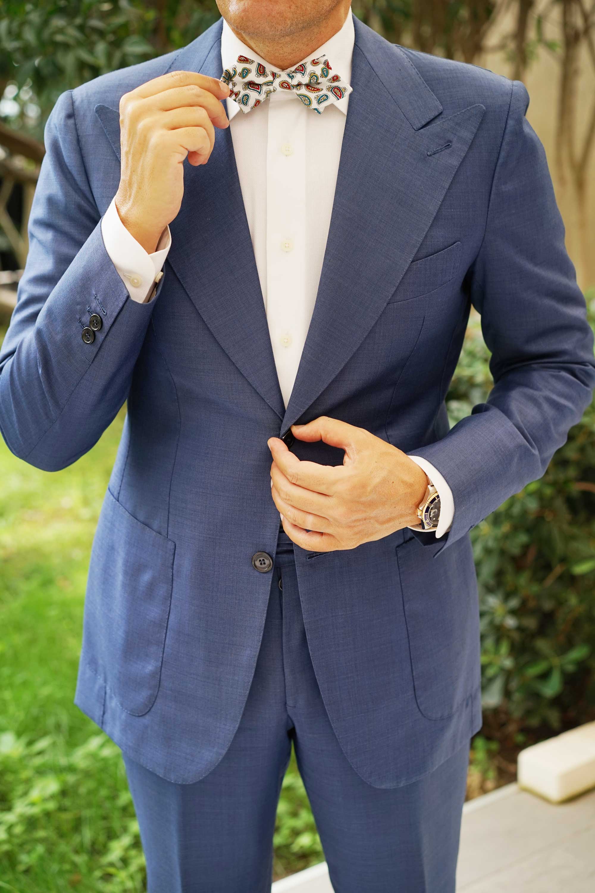 Make a sophisticated statement at your next event with OTAA's Ponte Vecchio White Paisley Diamond Bowtie. The white palette of the Ponte Vecchio White Paisley Diamond Pre-Tied Bowtie is met with ebullient turquoise, red and yellow paisley teardrop details for an artistic accent. OTAA’s hand-stitched approach to tailoring means this diamond bowtie is smooth to the touch and emanates a high-quality presence as part of formal ensembles. Providing an elegant way to finesse your formal tailoring, this vivacious Ponte Vecchio White Paisley Diamond Bowtie features a decadently smooth fabric and a sophisticated design.