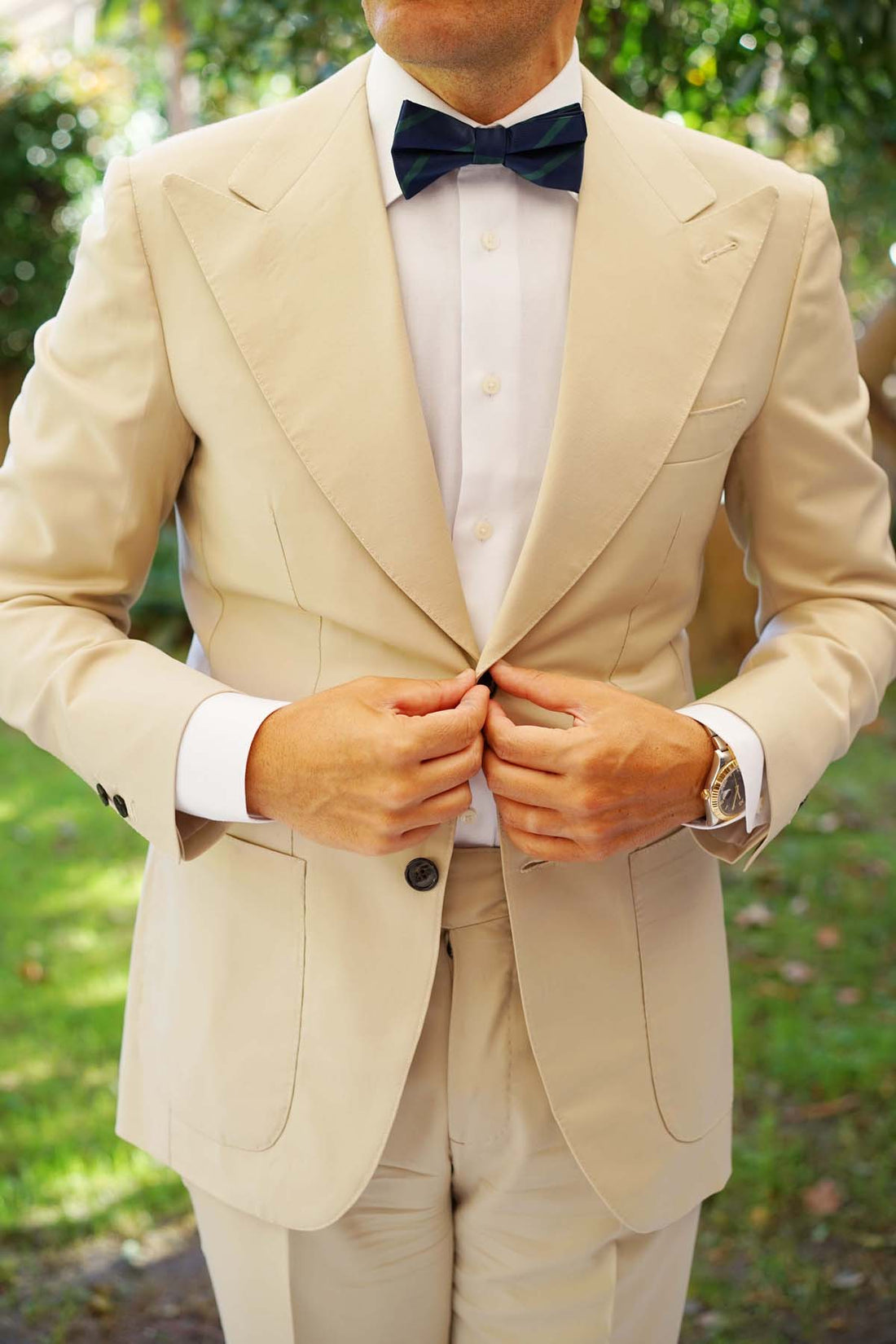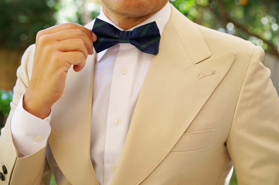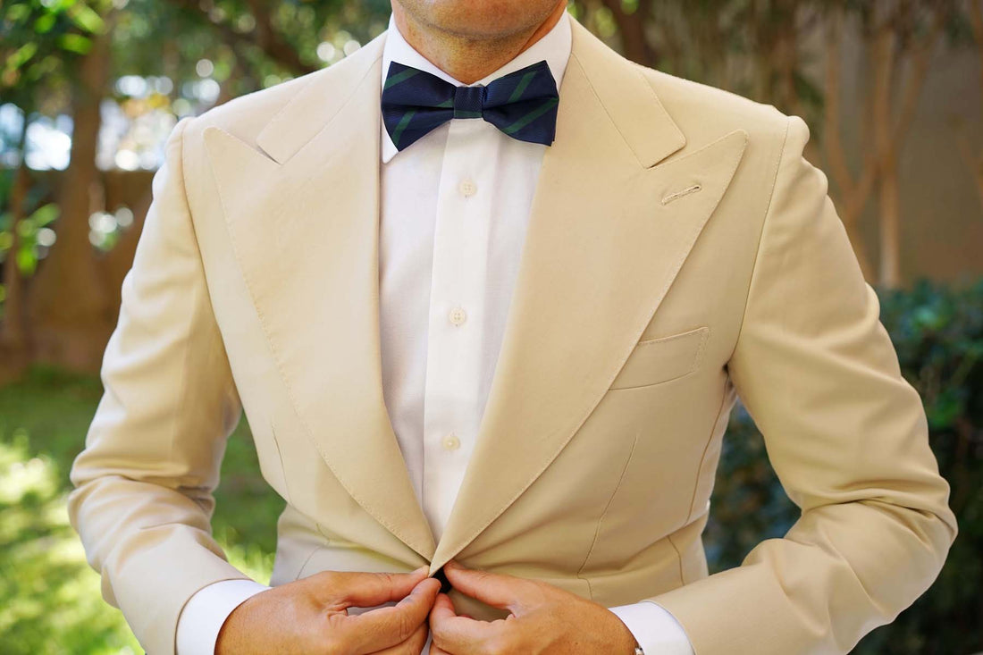 OTAA’s Brunswick Green Striped Bow Tie offers a wealth of luxury. Constructed by hand and tailored from a satin cloth, this bow tie gives a high-quality outlook to your formal styles. The exquisite design is embellished with horizontal textures and a diagonal striped pattern for a stylish point of difference. Finessed in a refined navy blue palette, this Brunswick Green Striped Pre-tied Bowtie is superbly complemented by sophisticated green accents. Wear it to give an elegant statement at formal occasions. Designed exclusively by the Brothers at OTAA.