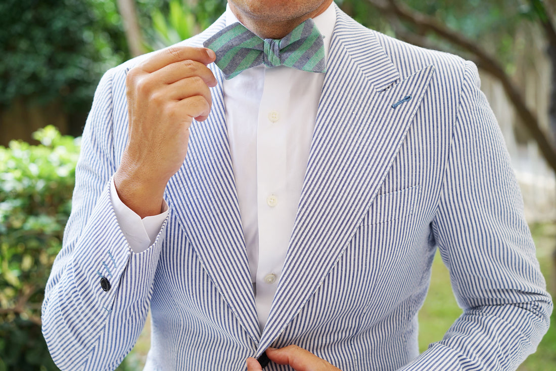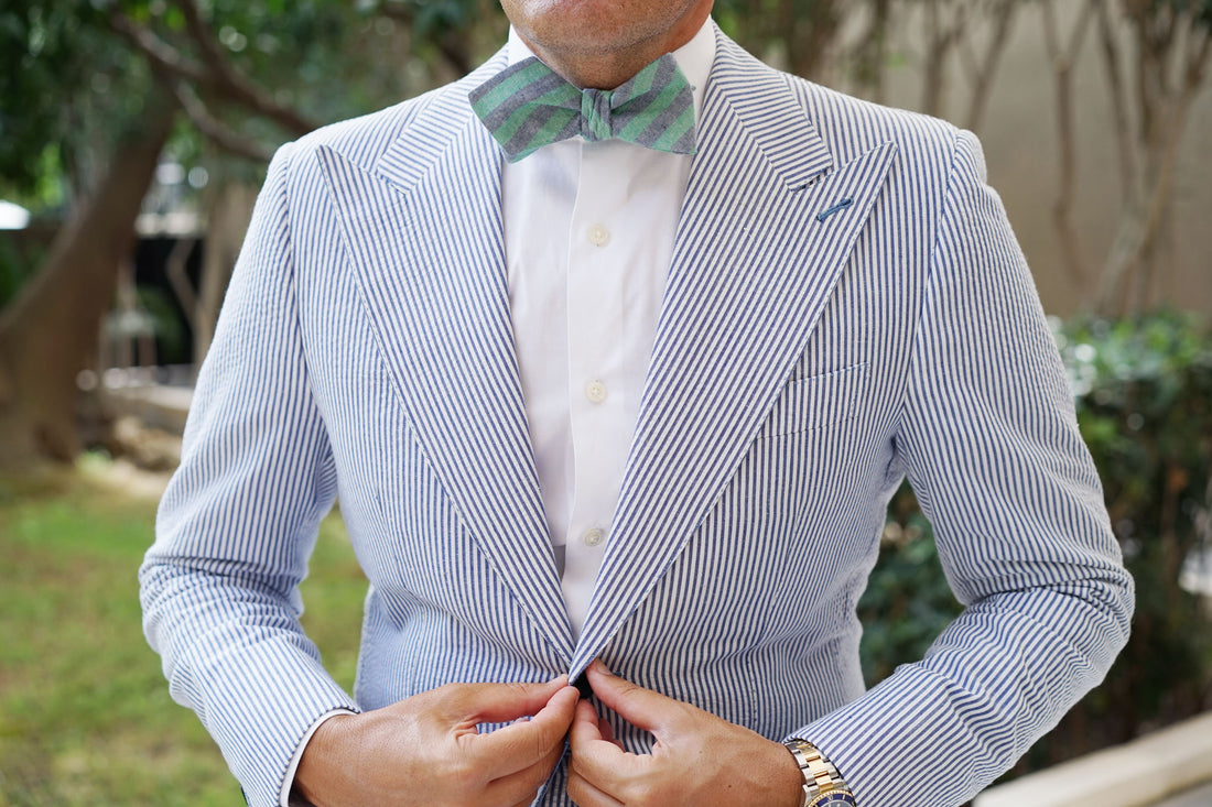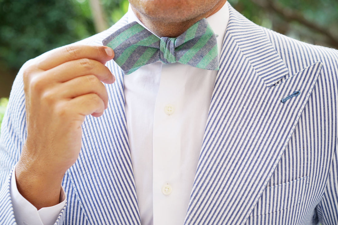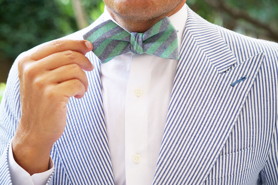 To produce the Green & Blue Bengal Linen Diamond Self-Tie Bow Tie, we took a quick trip to the Amazon. We find this tends to aid with the design process. Endeavouring to catch a glimpse of a Bengal tiger up close, we were shortly informed by a local tribe that Bengal tigers don’t actually live in the Amazon. We were feeling slightly disheartened and ready to go home, when suddenly; a colourful blue and green bird caught our eye. Inspired by the Bengal tiger and a really cool bird, OTAA presents the Green & Blue Bengal Linen Diamond Self-Tie Bow Tie.