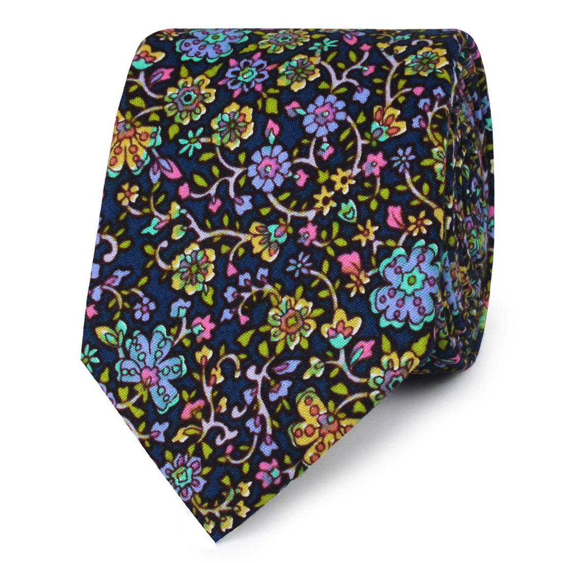 With a royal navy background and sophisticated floral pattern; the Tomba di Dante Floral Skinny Tie is finessed with purple, pink, green, yellow and aqua highlights. Crafted by hand and tailored from a plush cotton fabric, this thin tie effortlessly marries a high-quality outlook with unsurpassed sophistication. Exclusively designed by the Brothers at OTAA, this Tomba di Dante Floral Thin Tie makes the perfect staple for tailored looks.