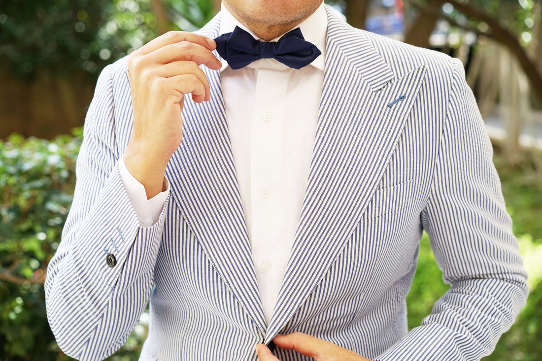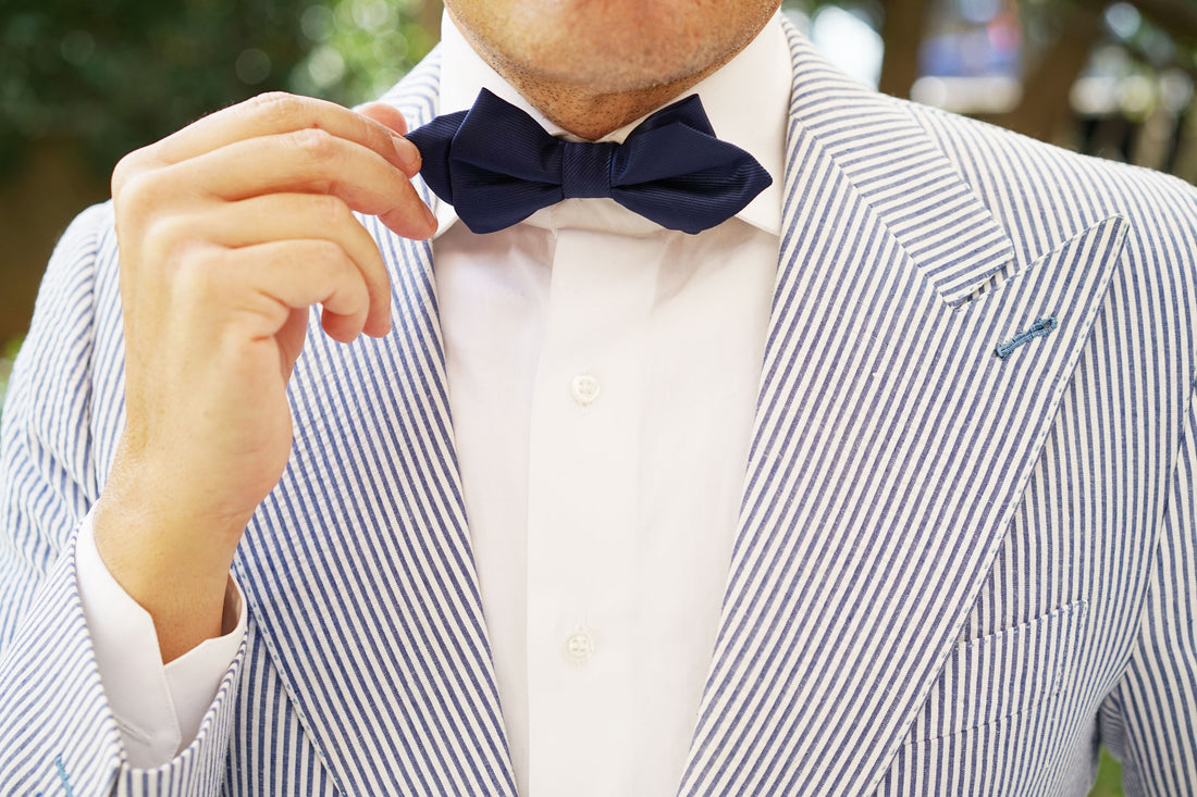 Gift your suits a formal flourish with OTAA's exquisite Navy Blue Line Diamond Bow Tie. Making a formal statement with considered suits, the Navy Blue Line Diamond Bow Tie will be your most reliable ticket to get you dressed to the nines! Because of its sheen, navy blue fabric, this diamond bowtie is a nautical masterpiece that will reward your wardrobe a versatile advantage. Let the intricate line-backing enhance the textural outlook of your suits and bring about a luxurious standpoint. This Navy Blue Line Diamond Bow Tie Diamond Bow Tie has been stitched by hand and tailored from a plush fabric to ensure you comfort and style every time you head out the door. Designed exclusively by the Brothers at OTAA.