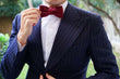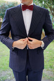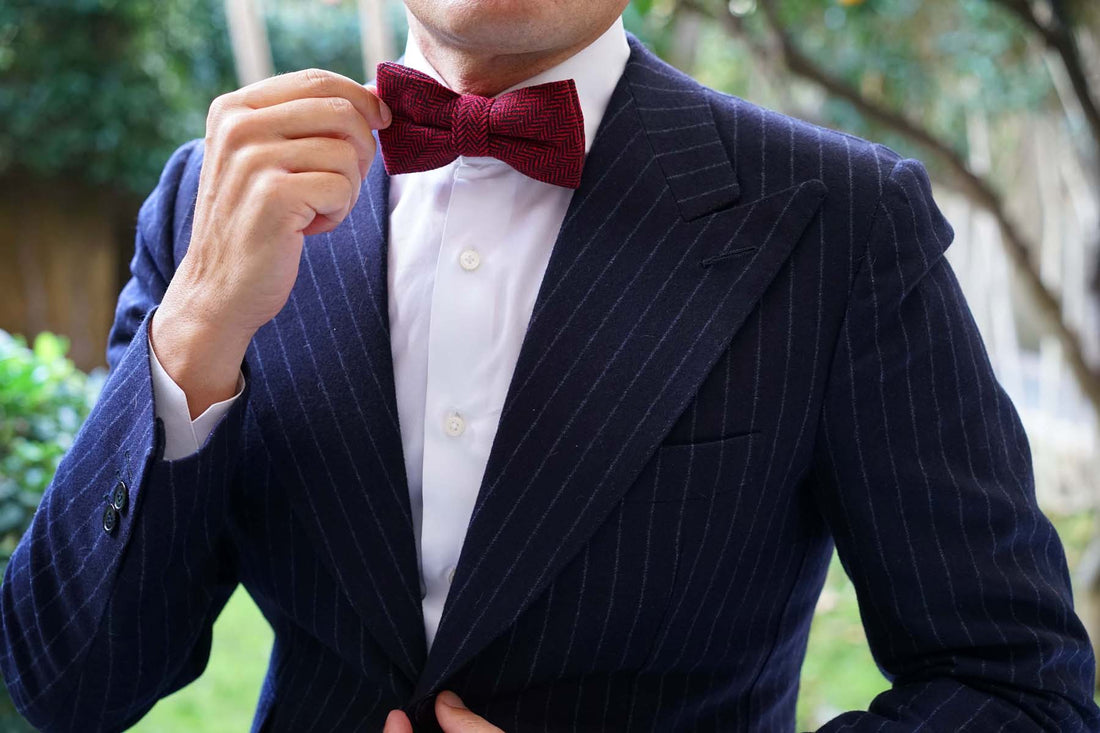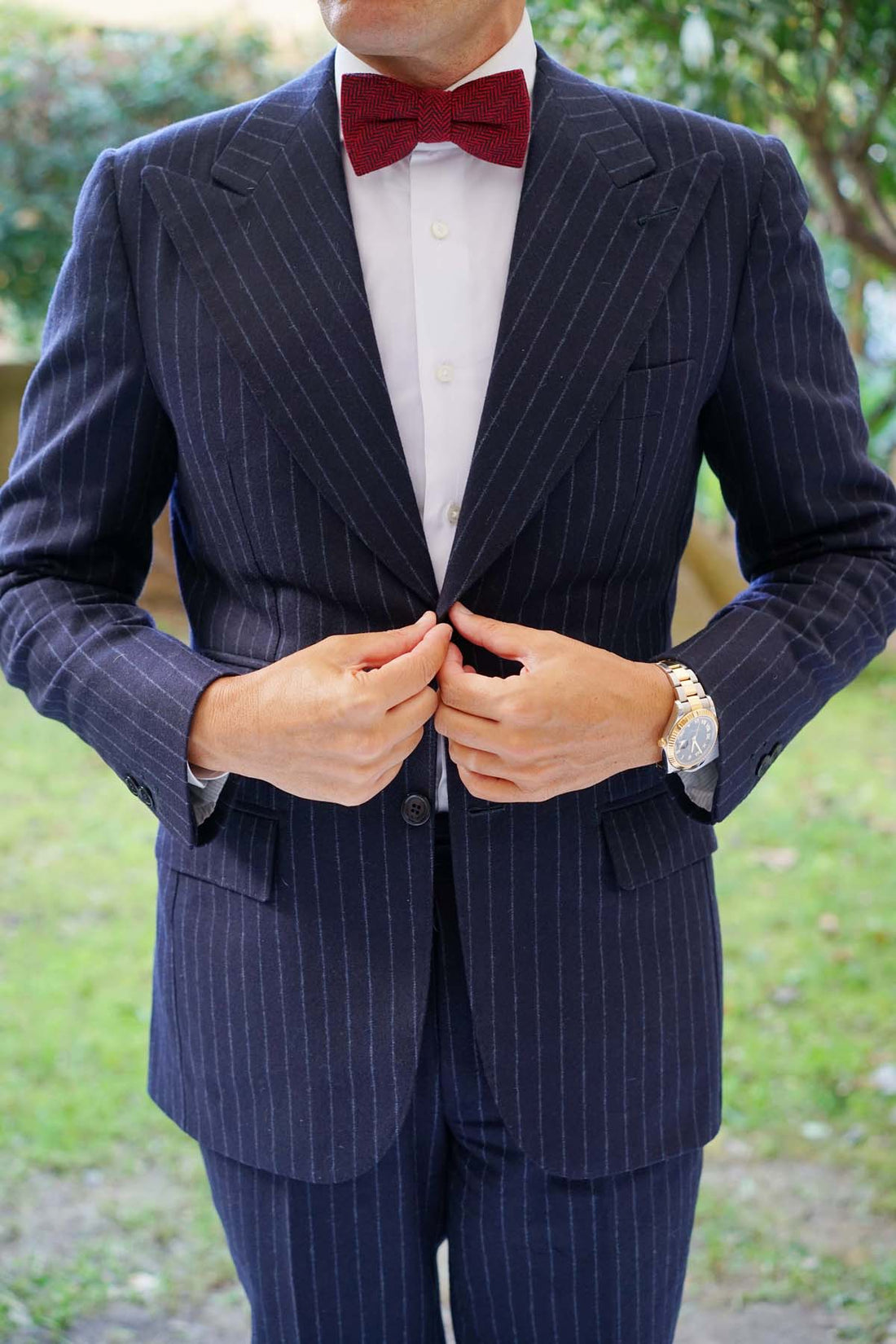 Luxurious details are part of The Brothers at OTAA's philosophy, and this Black & Red Herringbone Wool Bow Tie boasts plenty. Constructed with elegance and finessed with a hand-stitched approach, the Black & Red Herringbone Wool Pre-tied Bowtie brings a high-quality presence to your formal wear. The rich black and red shades will bring a striking tone to your tailored assemblage, and with an intricate herringbone pattern; your tailored looks will fall nothing short of detailed. Let the bow tie's thick, plush body give you a luxurious staple for the cooler months. Designed exclusively by the Brothers at OTAA.