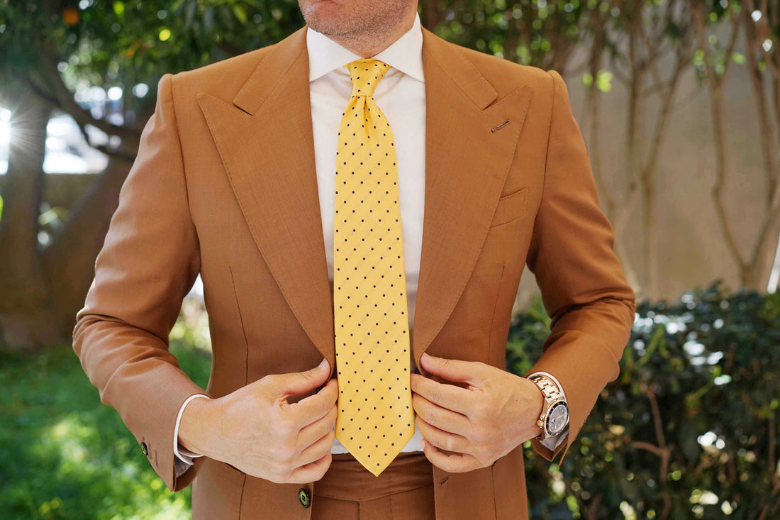 This men's yellow Necktie shows off a simple polka dot pattern on a vibrant yellow material. This Necktie for men can suit formal, party or business attire. The polka dot pattern on this style combined with the Necktie is best suited for making a statement.
