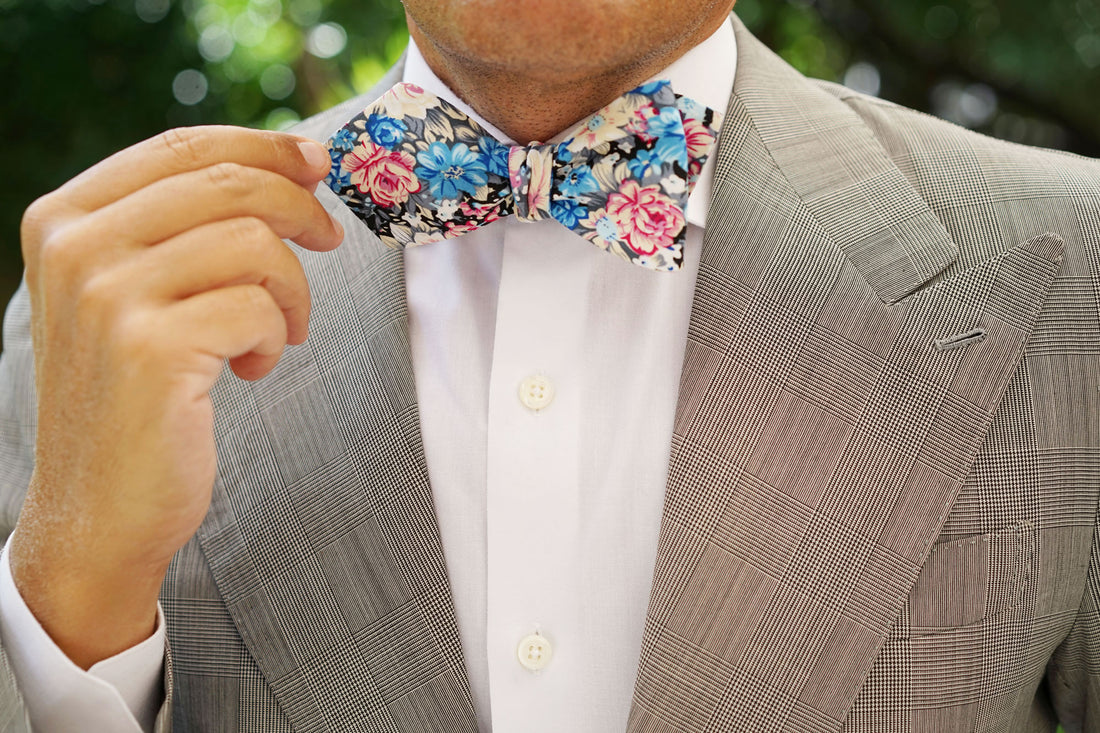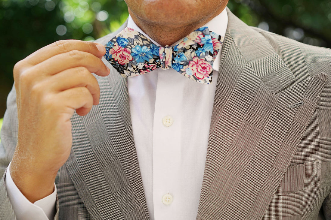 The Blue Water Lilies Floral Diamond Self-Tie Bow Tie offers unmistakable quality through its hand-stitched design and elegantly constructed body. The indulgent black background is met with vivacious blue, pink and cream features in an flamboyant water lily pattern. Designed exclusively by the Brothers at OTAA, this handsome diamond untied bowtie offers an accomplished accent to your formal tailoring.
