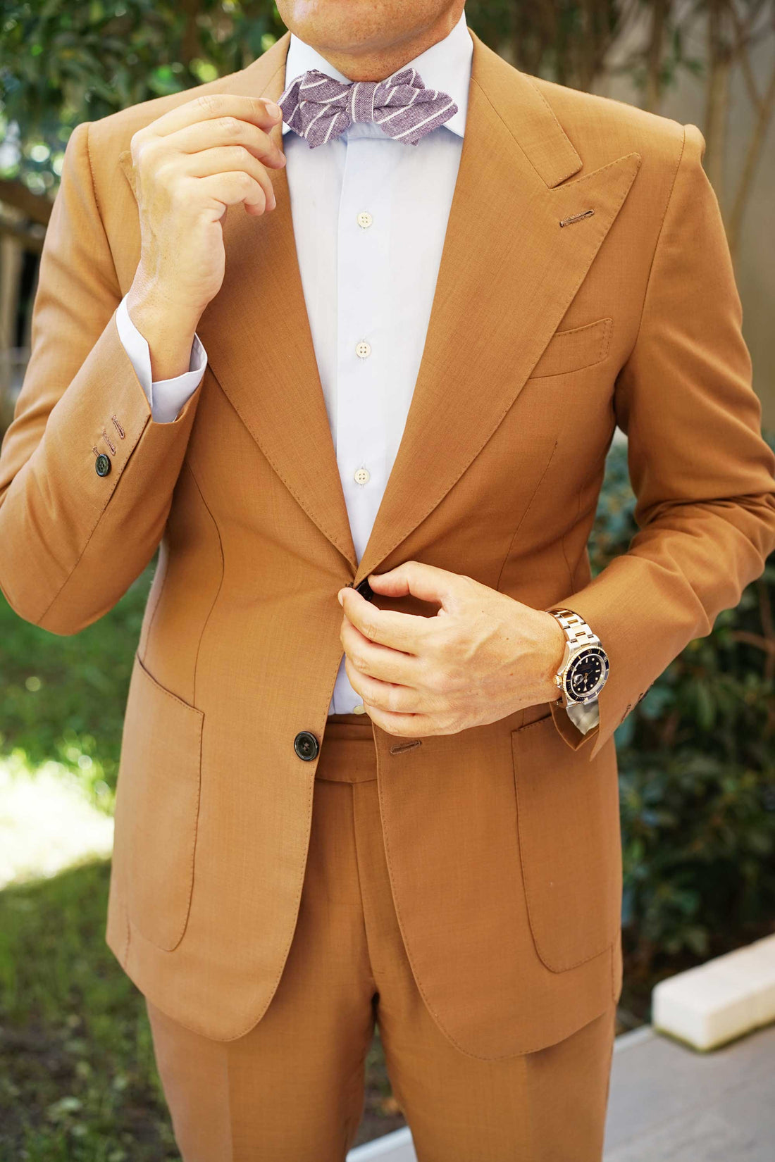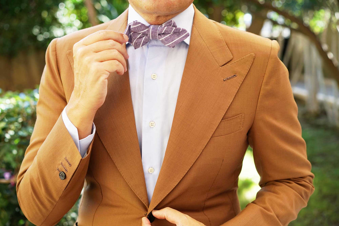 Elegantly striped and finessed in purple, OTAA’s Tyrian Linen Purple Pinstripe Diamond Bowtie makes an eye-catching statement. Impeccably tailored with a hand-stitched approach, this diamond pre-tied bowtie offers a divine demonstration of the label’s dedication to quality. The Tyrian Linen Purple Pinstripe Diamond Bowtie offers a breathable, lightly textured body that’s beautifully plush to the touch. Let the alluring purple complexion and fanciful diagonal striped pattern decorate your formal ensembles with an artistic flair. Designed exclusively by the Brothers at OTAA.