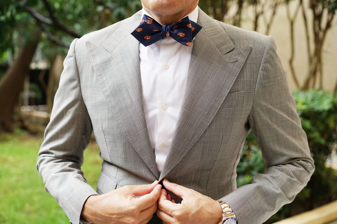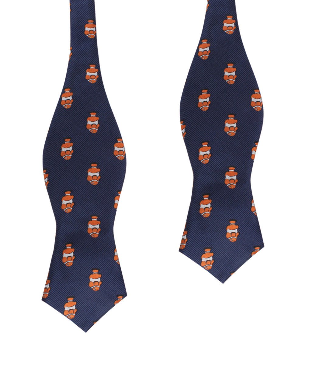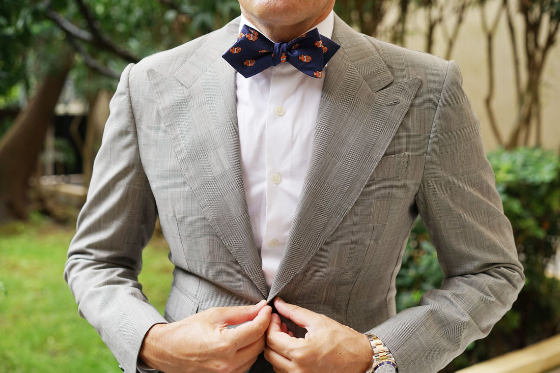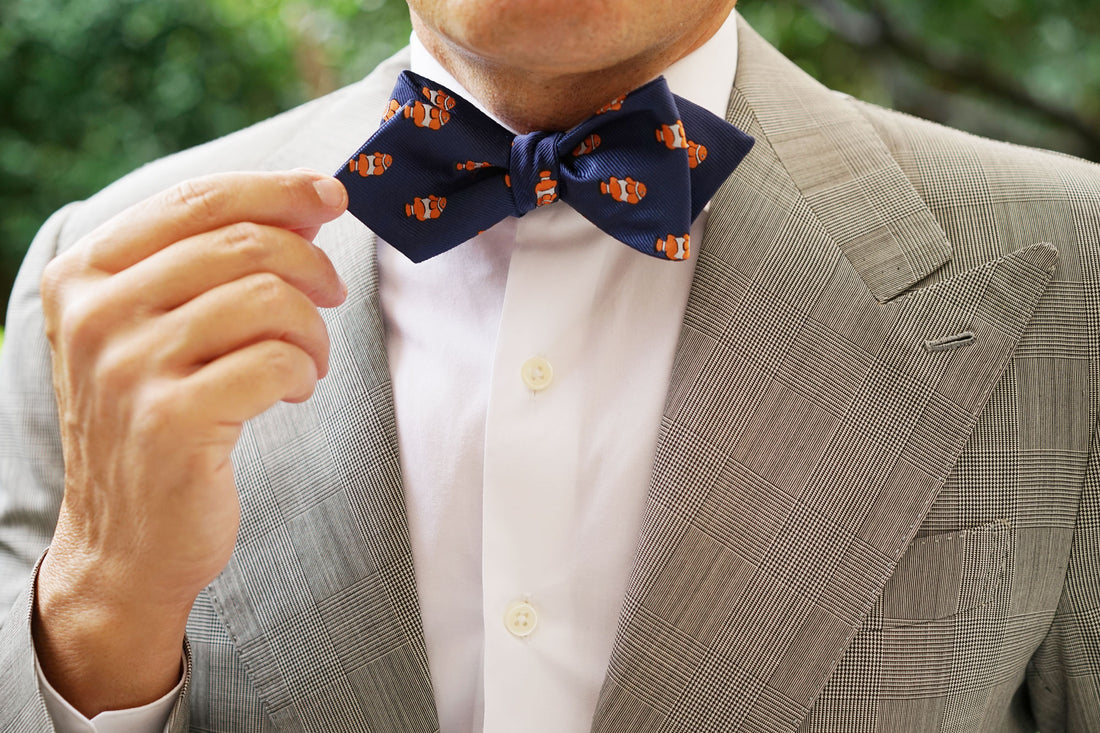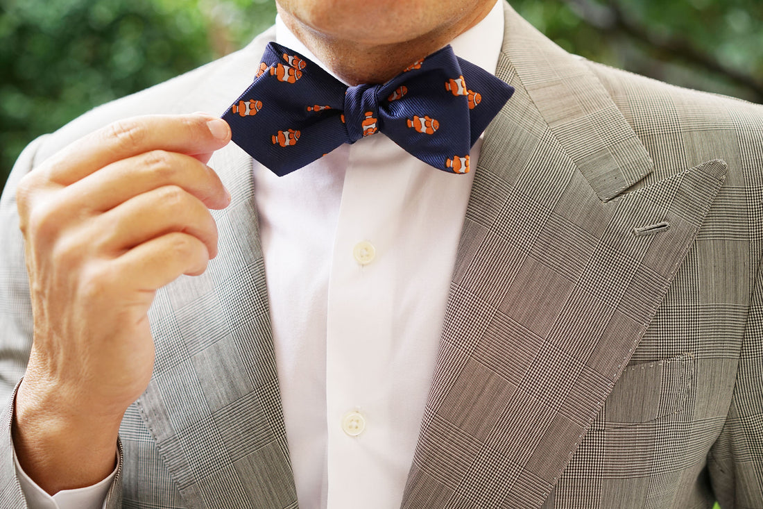 Inspired by the colourful fish, this Clownfish Diamond Bow Ties Self-Tie exudes fun and sophistication and is hand cut and sewn on a classic navy backing. Designed exclusively by The Brothers at OTAA.