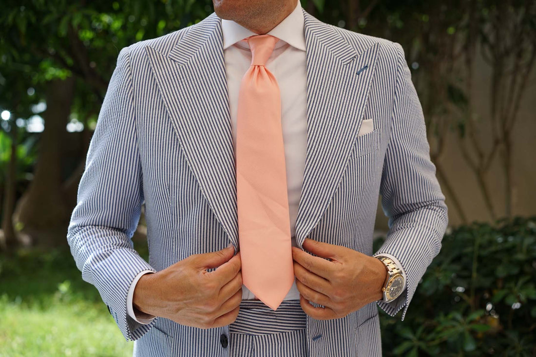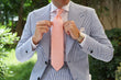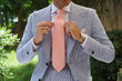Allow your eyes to drink in the glorious Bellini Peach Weave Necktie. The Bellini, a cocktail made from prosecco and peach pureé was invented around a century ago. The drink was named The Bellini because its unique pink colour matched that of the toga of a saint in a painting by 15th-century Venetian artist Giovanni Bellini. Now, the name takes on a new meaning, with the Bellini Peach Weave Necktie.
