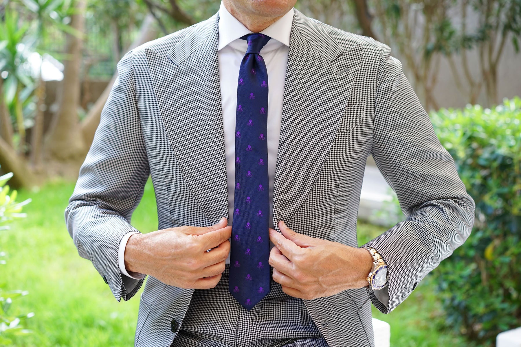 Punctuate your tailoring roster with this dashing Purple Octopus Skinny tie by The Brothers at OTAA. The common octopus has a wide array of techniques it uses to avoid or thwart attackers. The most amazing line of defence is its ability to hide in plain sight – the common octopus can almost instantaneously match the colours, patterns and even textures of its surroundings. Inspired by the ocean crawler that can blend in the deep blue depths – even though it’s purple – we bring you our Purple Octopus Skinny tie.