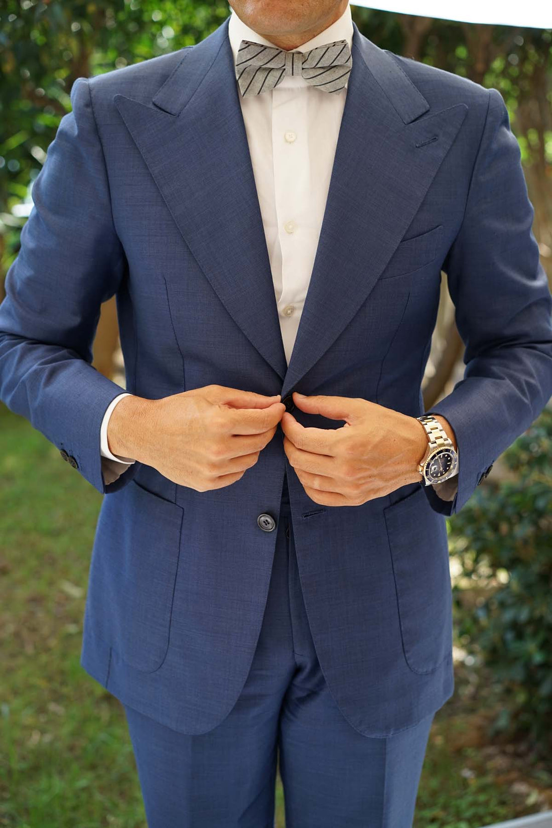 When designing this Ash Gray Pinstripe Bow Tie, we hired a special consultant; his name was Mr Bond. Not to be confused with James Bond- our Mr Bond was a short Italian guy with a wispy goatee. He said, “You know, this Ash Gray Pinstripe Pre-tied Bowtie is one of the best designs I’ve ever seen. It would go great with a classic suit jacket!"