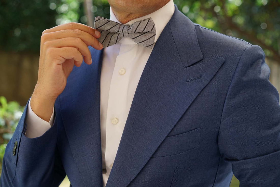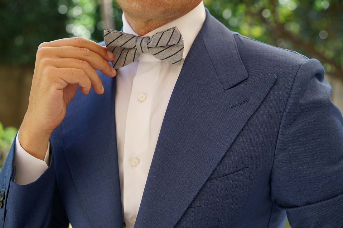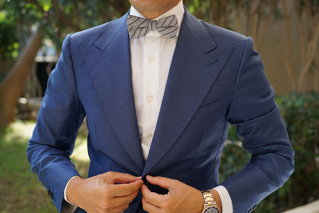 Finessed in a soft gray palette, this pre-tied bowtie showcases black diagonal pinstripes. Hand-stitched and tailored to perfection, the superior quality of the Ash Gray Pinstripe Bow Tie is unmistakable. Designed exclusively by the Brothers at OTAA, this Ash Gray Pinstripe Bow Tie is recommended by Mr Bond himself (the Italian consultant)