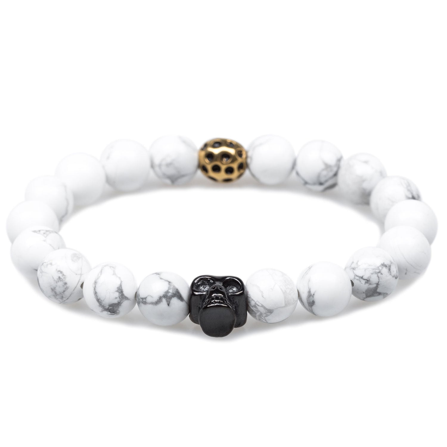 An eclectic addition the OTAA range, this White Howlite Raven Skull Bracelet is brimming with textural intricacy. In 1947 the most complete skull of an Australopithecus was found, one of man's distant relatives. The skull was believed to be over 2.5 million years old and gave mankind the most comprehensive glimpse into our ancestry to this day. With immaculate design and craftsmanship at the forefront of this design, OTAA's White Howlite Raven Skull Bracelet emanates an air of adventure. Howlite is a white mineral with grey veining that invoked an intricate, fresh palette. The gold and silver charms featured in this bracelet were hand-chiselled to perfection and finessed with intricate embellishments. Wear this in-house to design to add a formal completion to your tailored looks.