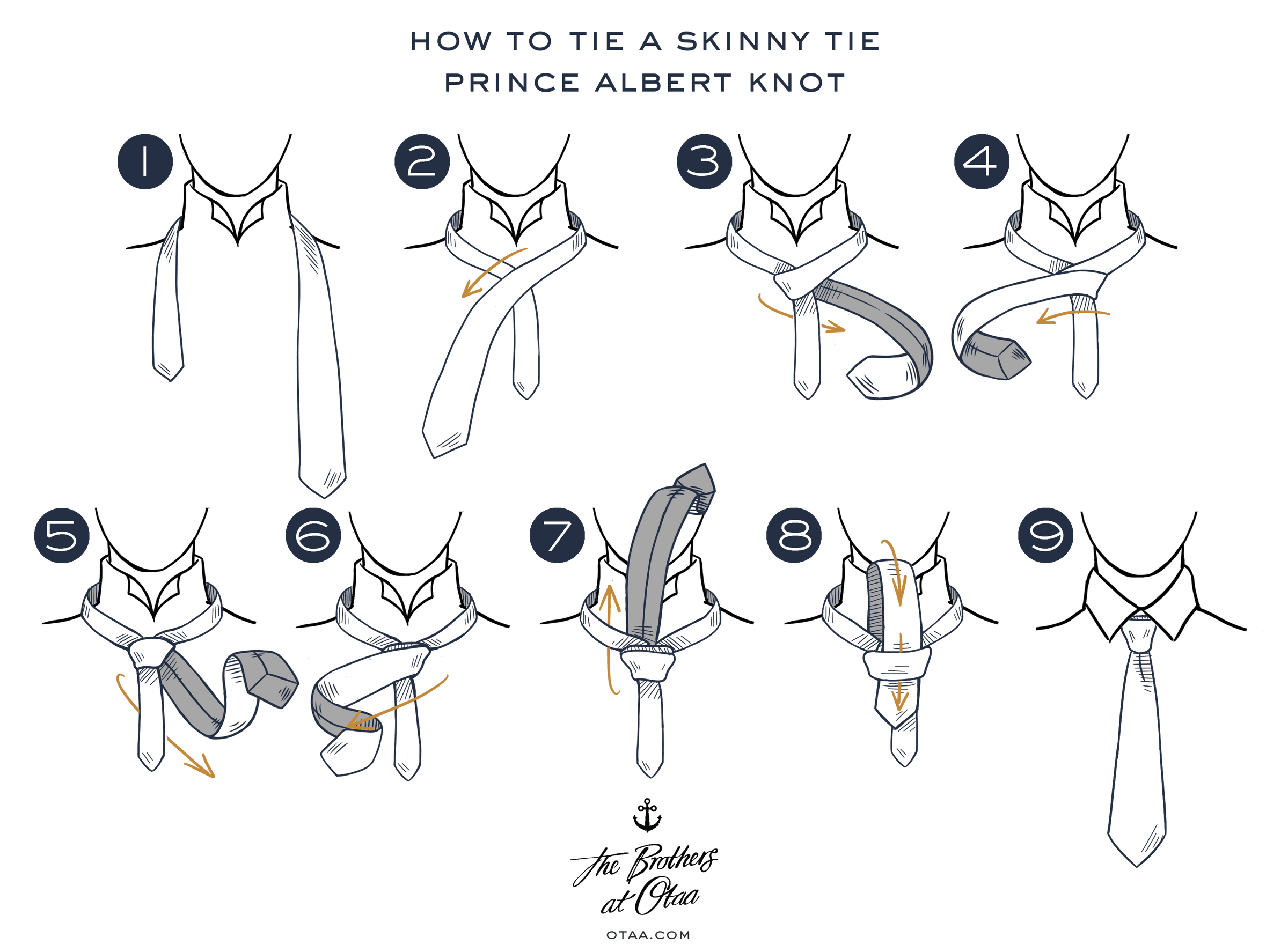 Skinny ties can require a little more attention than standard neckties because they need a tie knot that packs a bit of extra punch. Because skinny ties are only 3/4 the width of standard neckties, they need a special knot that makes them look more robust than they really are. Cue: the Prince Albert Knot. It's big and confident- just like you.