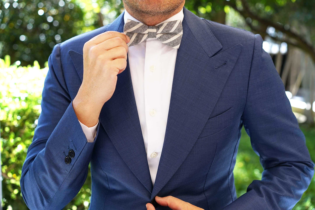 Every distinguished gentleman should be in possession of at least one striped bow tie bowtie, and this in-house design is a flawless option. Featuring a faded black and white diagonal striped pattern, this pre-tied bowtie will imbue your formal tailoring with a sophisticated edge. Crafted by hand and tailored with elegance, this Adana Black Chalk Stripe Linen Bow Tie is a sophisticated staple. Designed exclusively by the Brothers at OTAA.