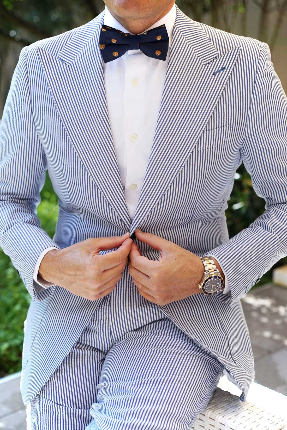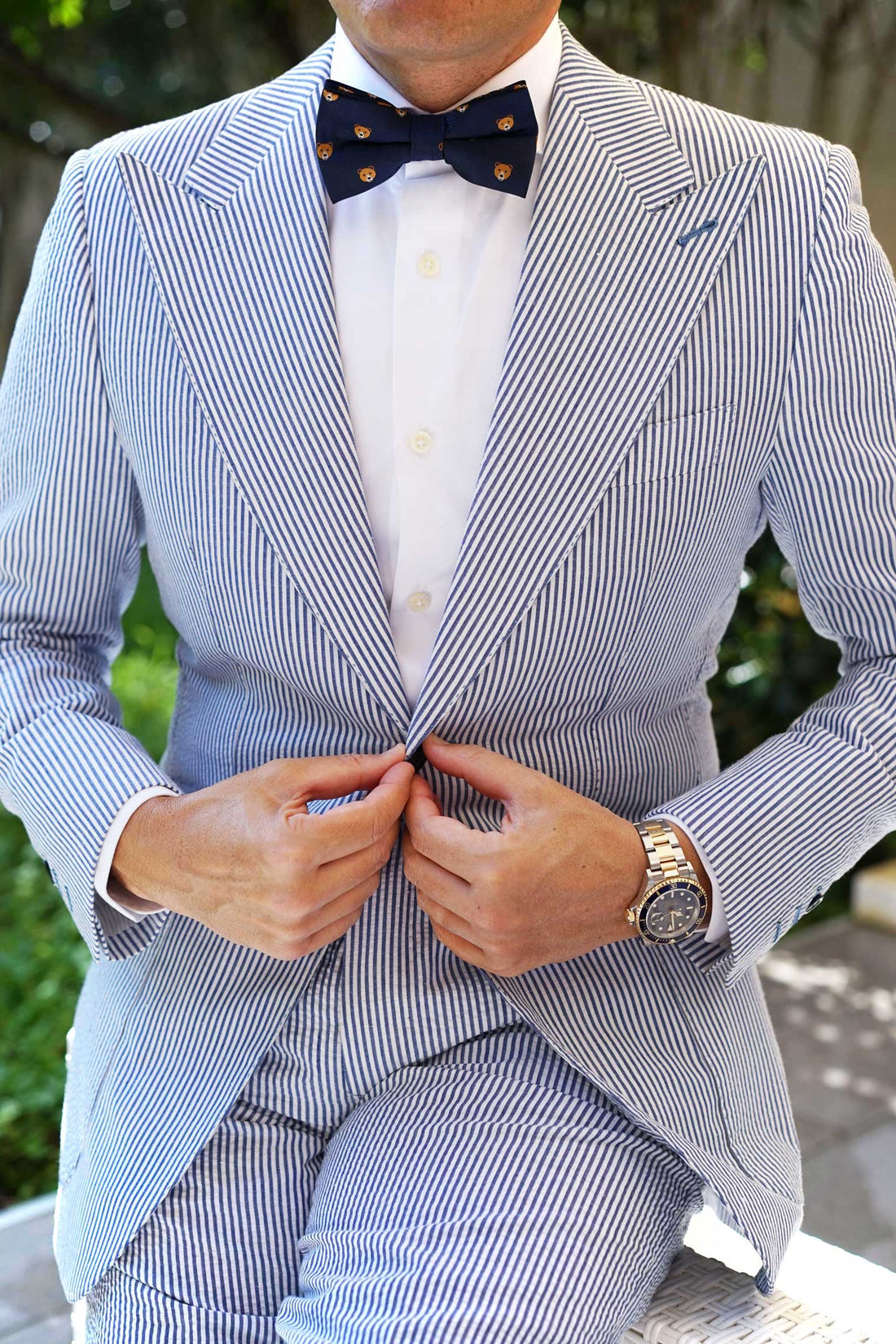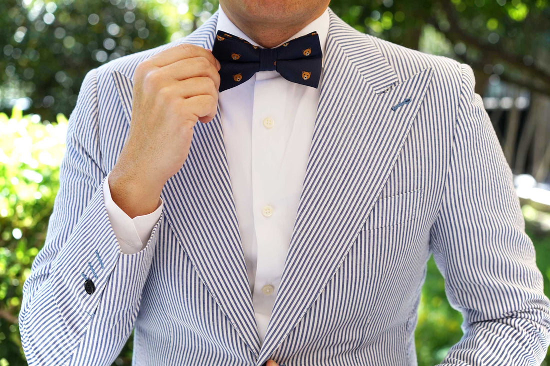 Our hand-sewn method allows the American Brown Bear Pre tied Bowtie to exhibit extraordinary detail as there is little machinery used in the crafting of this tie. Touches such as these make all the difference. Bears have an excellent sense of smell, better than dogs or possibly any other mammal. The American Brown Bear Bow Tie exudes sophistication and is hand cut and sewn on a classic navy backing. Designed exclusively by The Brothers at OTAA.