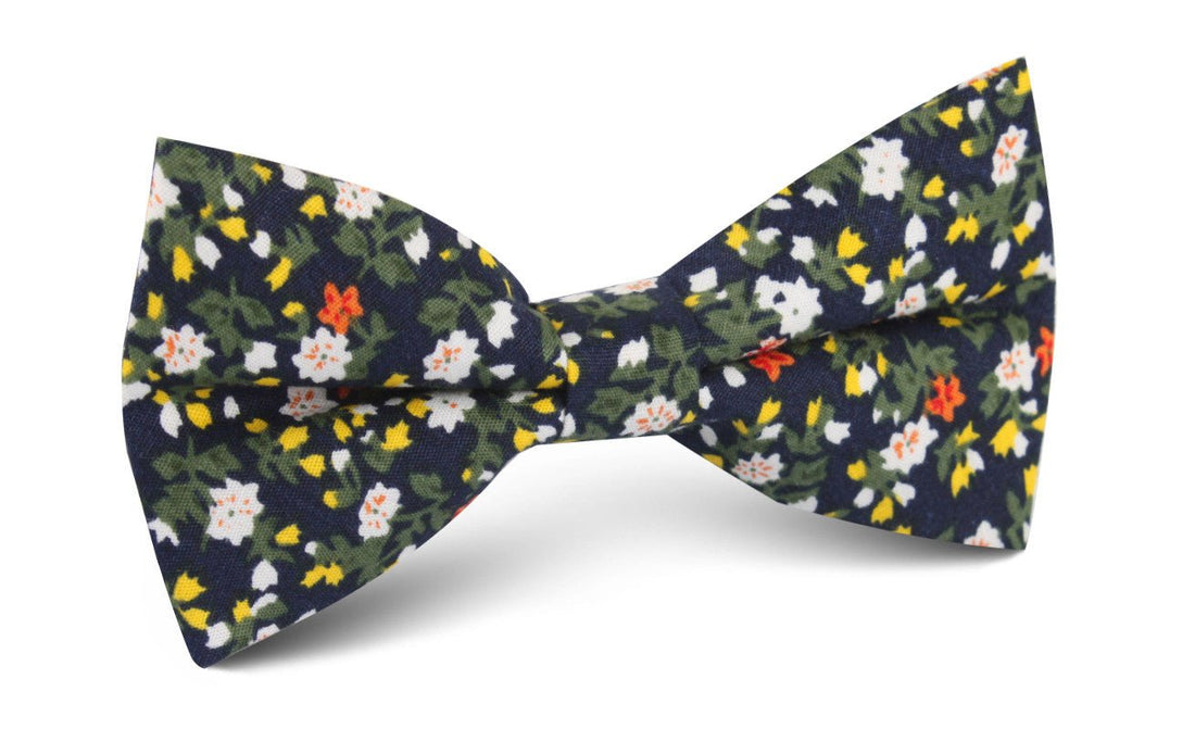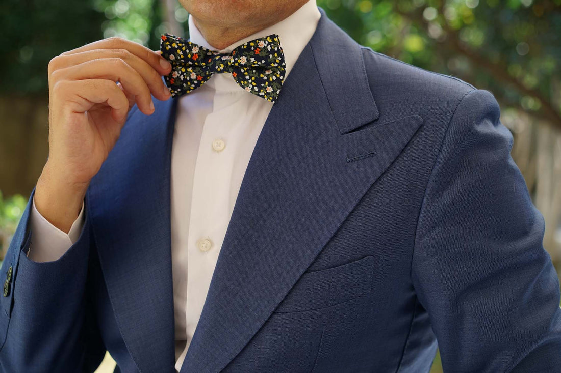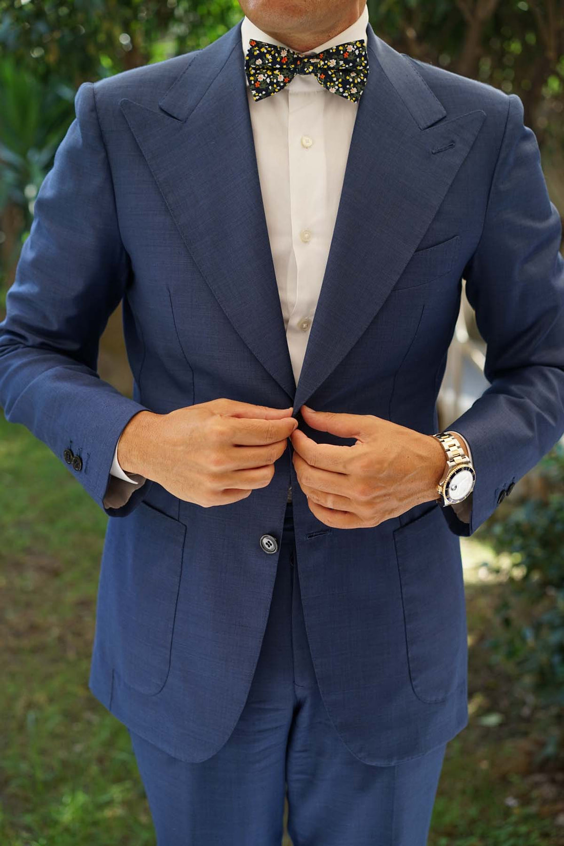 The indulgent navy palette of this pre-tied bowtie is met with green, yellow, orange and white highlights for an artistic appeal. Beautifully decorated with a floral design, the Anemone Floral Pre-tied Bowtie offers makes an elegant asset to your evening looks. Stitched by hand and magnificently tailored from cotton, the sleek style of this bow tie is met with superior quality. Designed exclusively by the Brothers at OTAA.