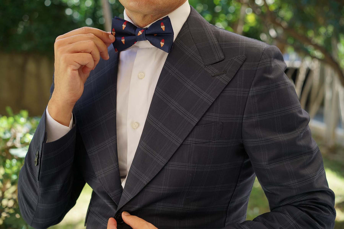 The Artemy Ice Cream Pre-tied Bowtie is sweetly tessellated with delicious ice cream cones that are fit for a king. The vibrant orange, brown and red accents give an artisanal accent to the sophisticated navy blue fabric. Constructed by hand and tailored from a satin fabric, this Artemy Ice Cream Bow Tie effortlessly marries style with the label’s high-quality philosophy. Designed exclusively by the Brothers at OTAA.