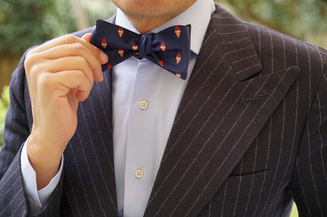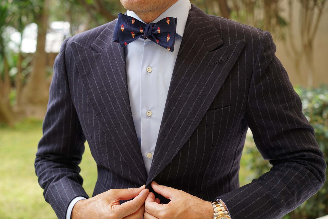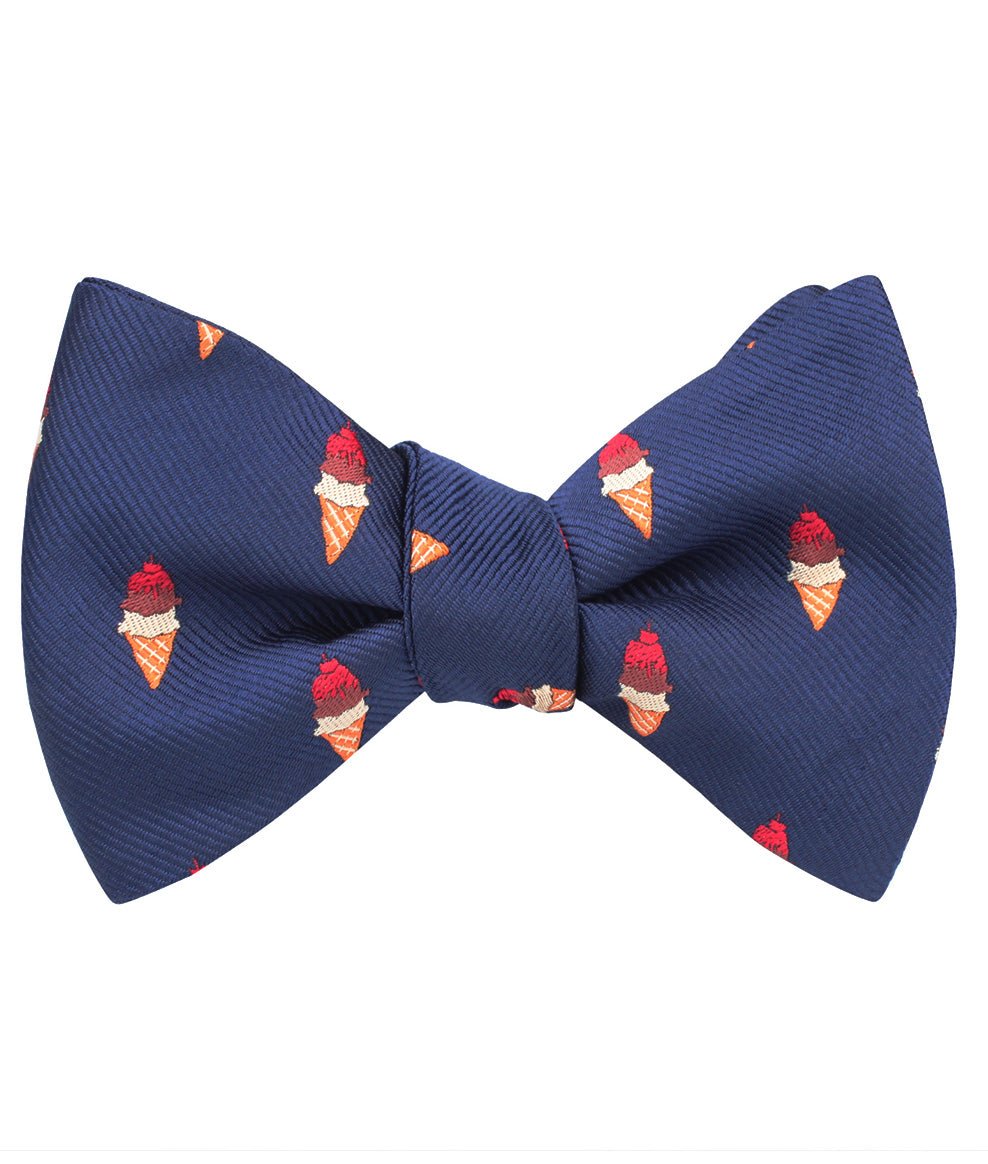 The Artemy Ice Cream Untied Bow Tie is sweetly tessellated with delicious ice cream cones that are fit for a king. The vibrant orange, brown and red accents give an artisanal accent to the sophisticated navy blue fabric. Constructed by hand and tailored from a satin fabric, this Artemy Ice Cream Self Tie Bow Tie effortlessly marries style with the label’s high-quality philosophy. Designed exclusively by the Brothers at OTAA.