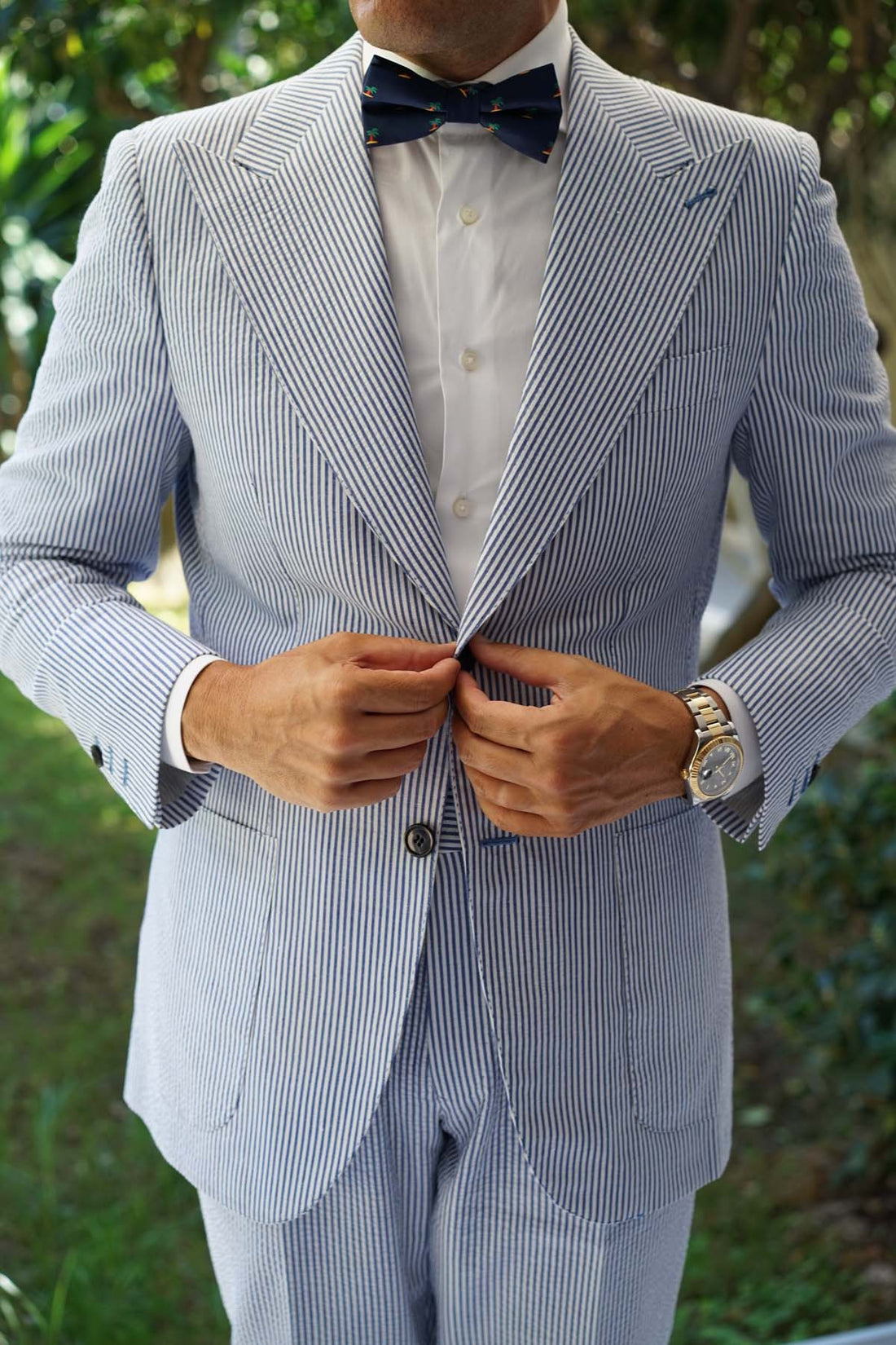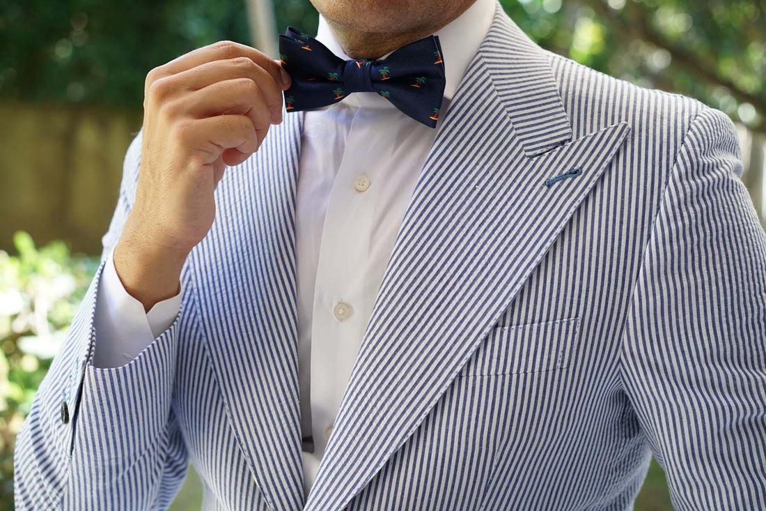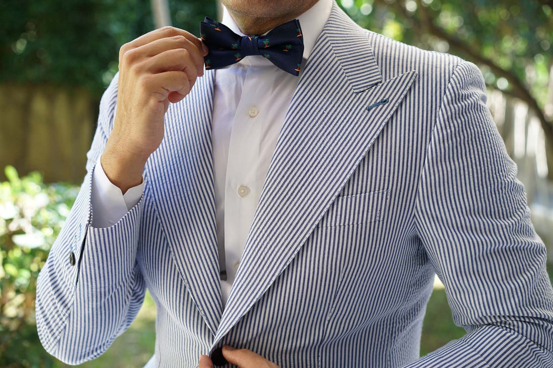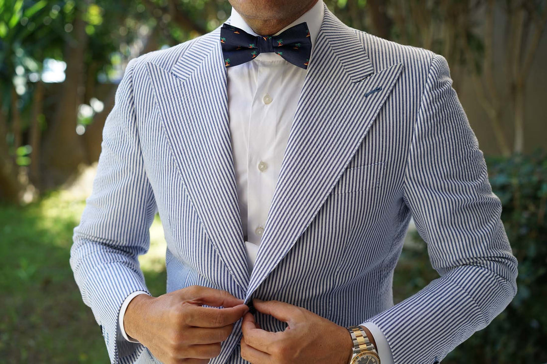 Palm trees are a quintessential symbol of paradise and relaxation, so it makes sense this Aruba Palm Tree Bow Tie makes the perfect staple for your holiday styles. If you don’t have the luxury of taking it on vacation, that’s fine too- wear it to the boardroom for a carefree look. Your boss will love it! Soon you’ll be working from a hammock and replacing your coffees with coconuts. You might get fired but hey- livin’ la vida loca’. With handcrafted tailoring and a decadently soft fabric, the Aruba Palm Tree Pre-tied Bowtie is a luxurious staple for high-quality style. It's finessed with green, yellow, brown and navy blue hues for a lively injection of colour. Designed exclusively by the Brothers at OTAA.