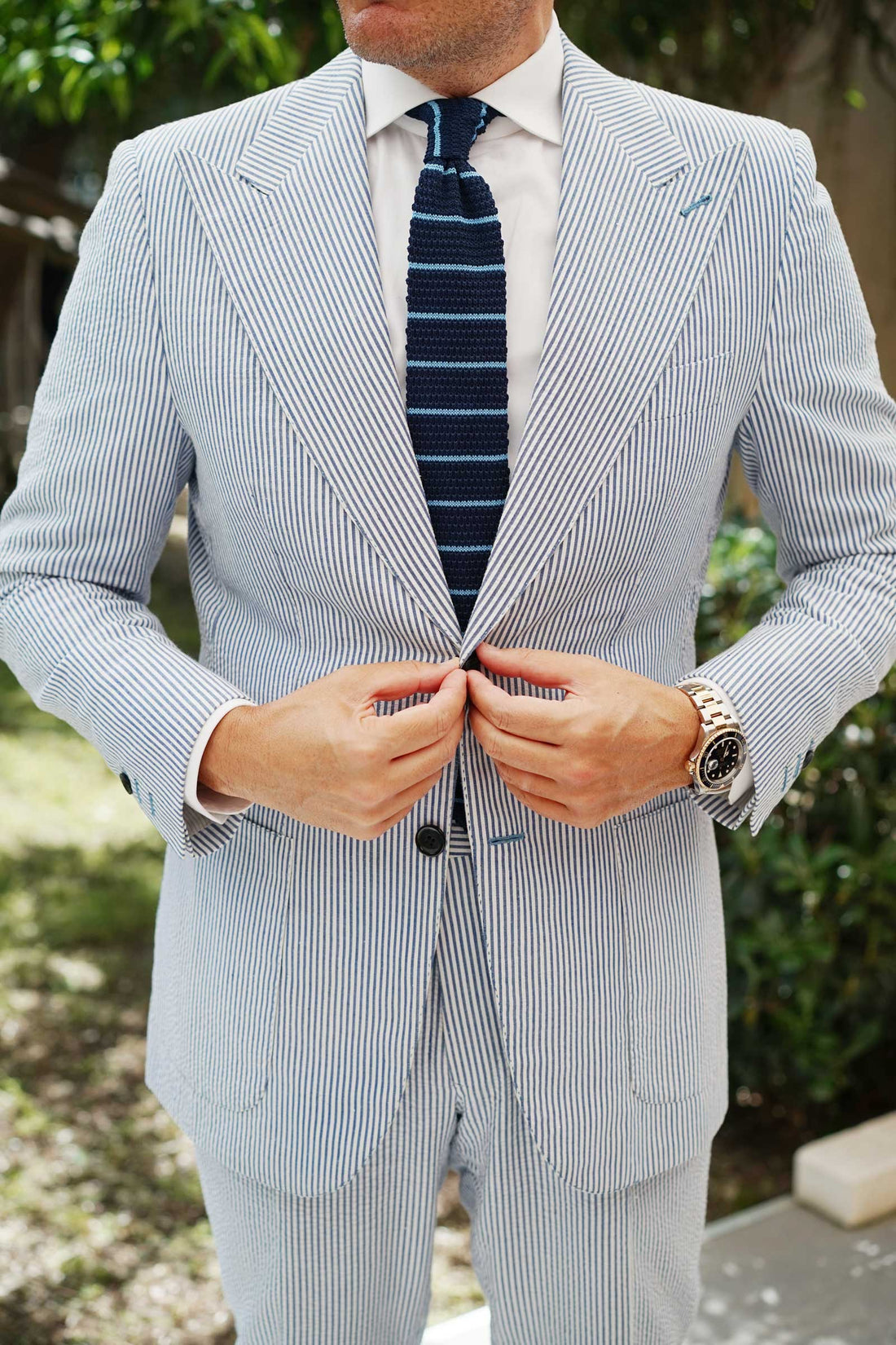 Channel a sleek aesthetic with the enthralling stripes of OTAA's Axel Blue Striped Knitted Tie. Boasting double-toned blue hues, this knitted tie will accent your tailored looks with a nautical appeal. This knitted tie is characterised by its textured, loosely woven appearance, and its slightly springy feel. The handwoven design is paired with an eye-catching striped pattern to deliver unparalleled style and comfort for any occasion. This easy-to-wear Axel Blue Striped Knitted Tie pairs superbly with crisp-whites for an accomplished look.
