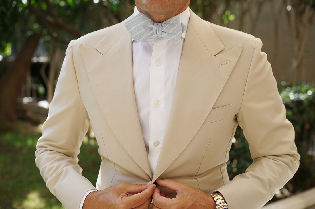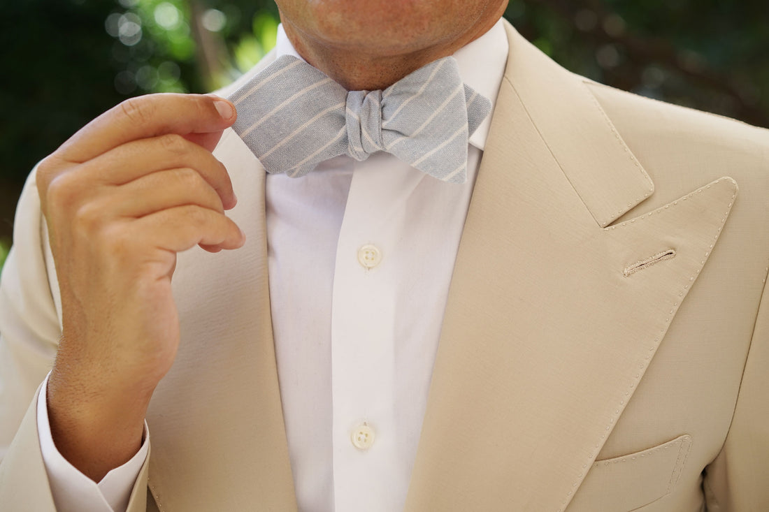 Detailed and contemporary, this Baby Blue Wide Pinstripe Linen Diamond Self-Tie Bow Tie makes a refined statement. Beautifully inspired by the soft hues of the sky, this Baby Blue Wide Pinstripe Linen Diamond Self-Tie Bow Tie makes a fresh addition to your wardrobe assemblage. Every distinguished gentleman should be in possession of at least one classic striped bow tie, and OTAA’s Baby Blue Wide Pinstripe Linen Diamond Self-Tie Bow Tie is a flawless contender. Brilliantly decorated with diagonal white pinstripes, this diamond untied bowtie is finessed with elegant light blue hues. Crafted by hand and expertly tailored, the Baby Blue Wide Pinstripe Linen Diamond Self-Tie Bow Tie offers a breathable fabric that’s lustrously plush. Designed exclusively by the Brothers at OTAA.