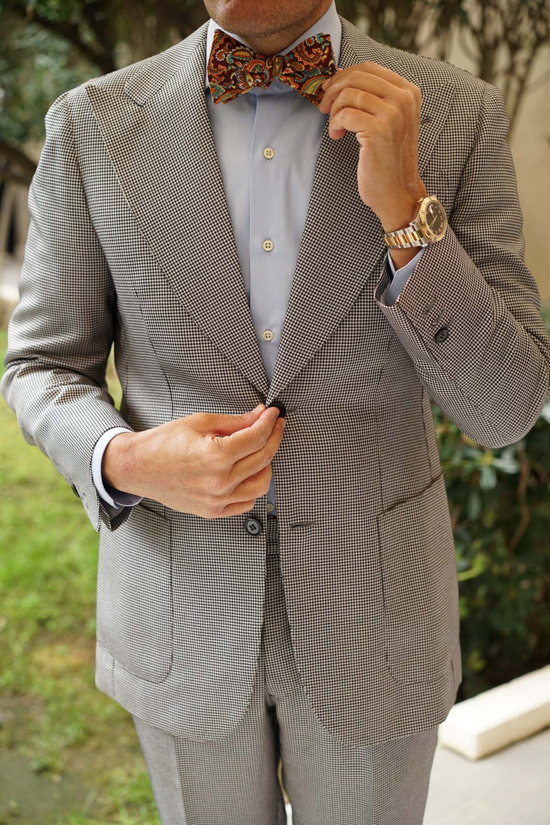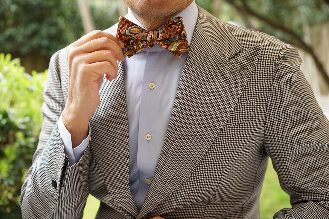 To aid with the design of the Baku Paisley Orange Self Tie Bow Tie, we took a quick trip to a museum to learn about Baku in Azerbaijan. After reading a plethora of history boards, we learnt that paisley designs are in no way associated with Baku. But we still really liked the name. So without history on our side, we present you with the Baku Paisley Orange Untied Bow Tie.