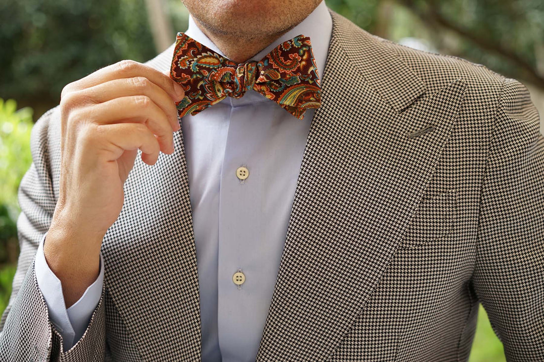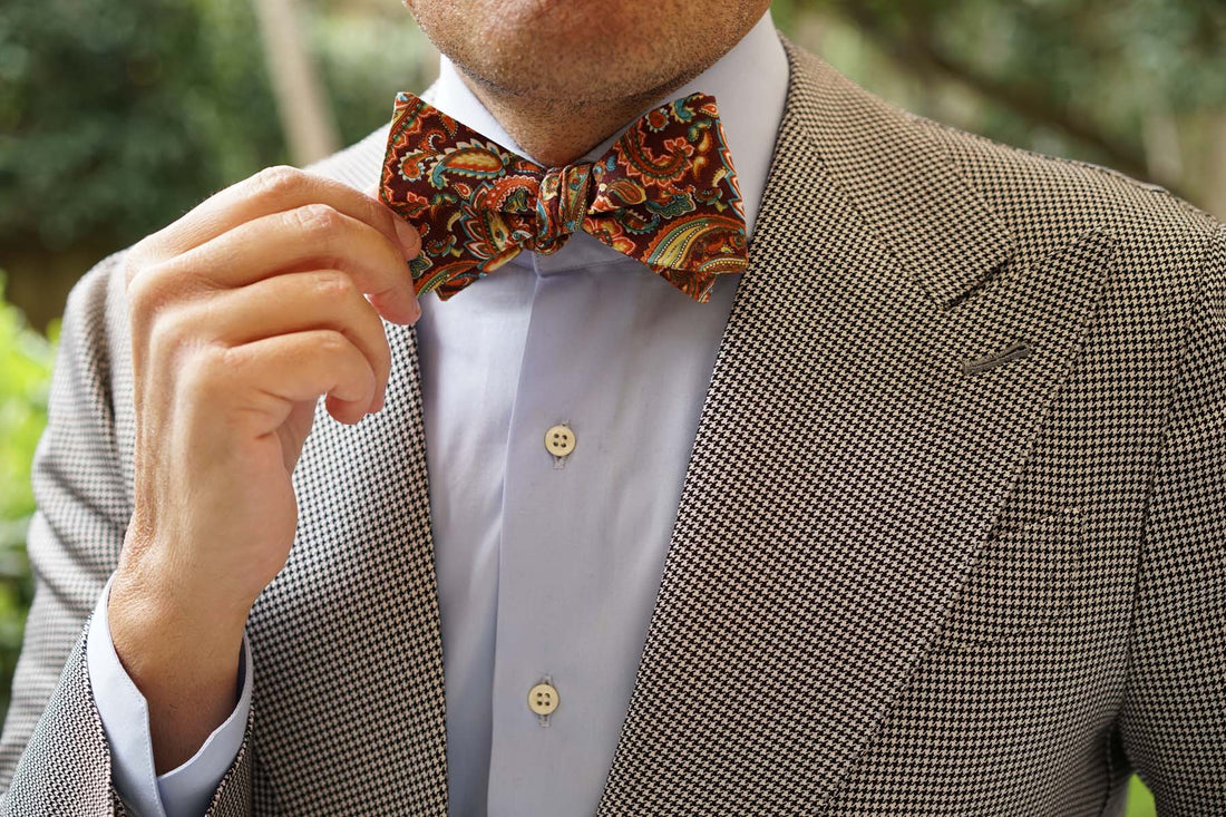 This Baku Paisley Orange Untied Bow Tie is a demonstration of unmistakable quality through its hand-stitched features and superbly tailored fabric. Soft to the touch and brilliantly constructed, this self tie bow tie is finessed with an intricate paisley pattern. The background offers a brown-maroon palette with decadent orange, yellow and aqua features for a sophisticated outlook. Designed exclusively by the Brothers at OTAA.