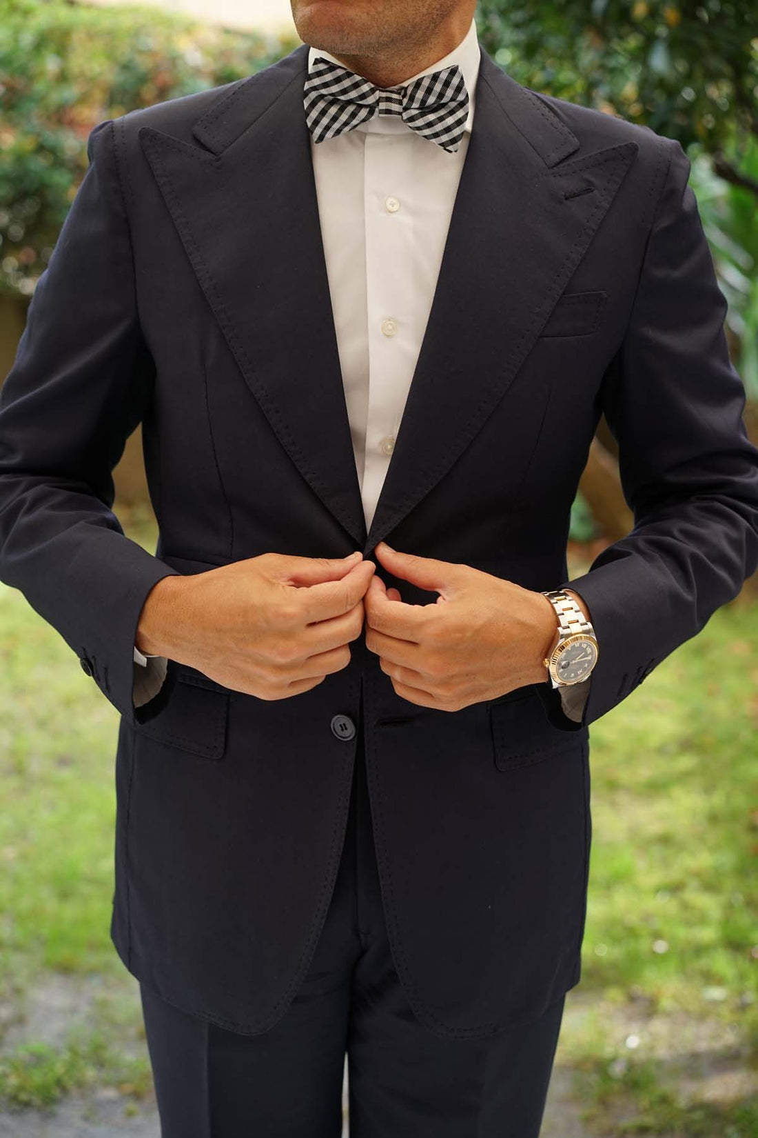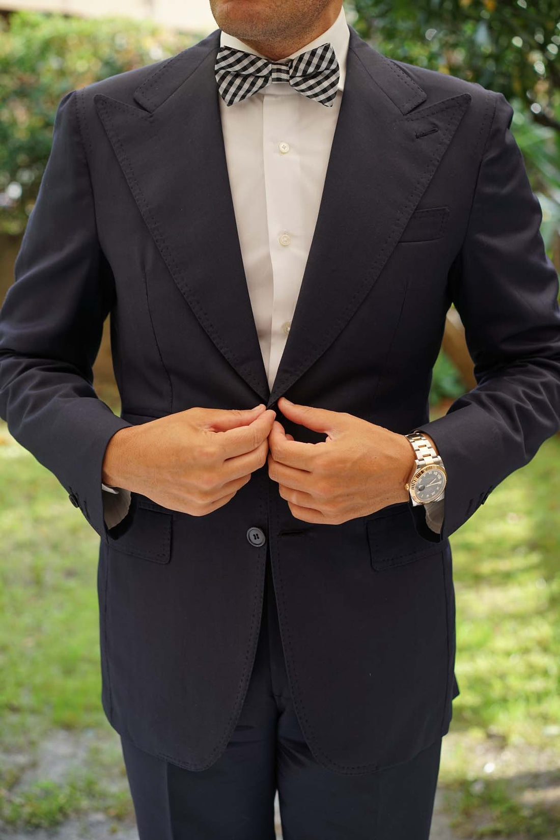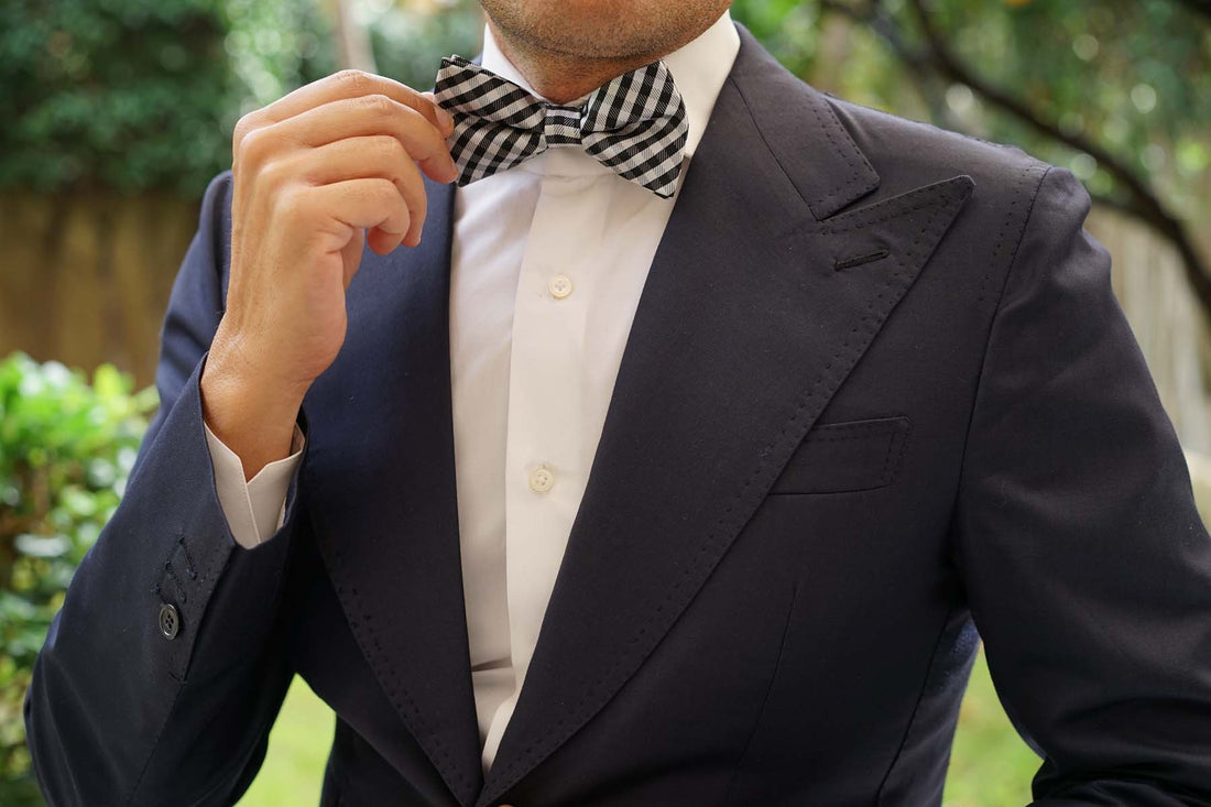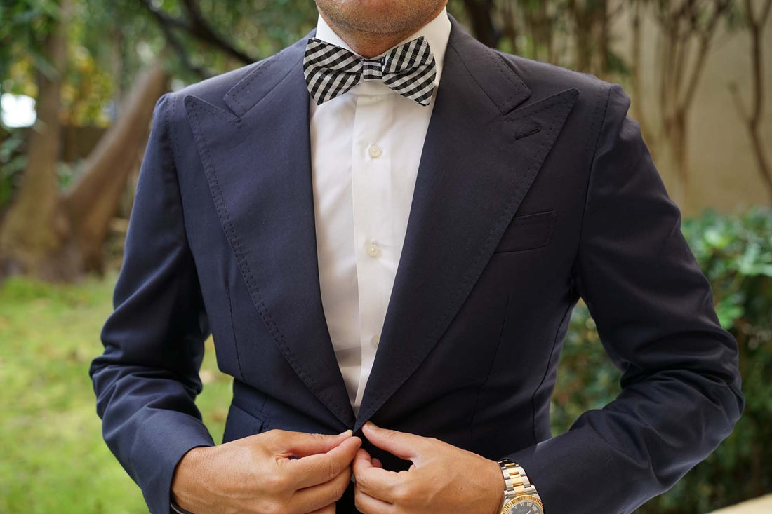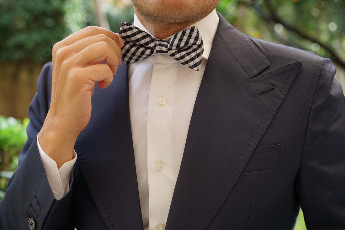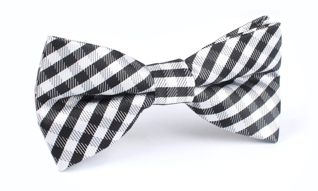 This Bow Tie has patterns of cream and raven black, embedded throughout the design. The Black Gingham Bow Tie with bold black lines and faded grey lines makes for a distinctive pattern suited for any gentleman.