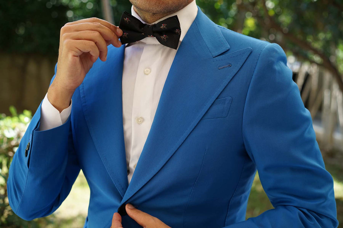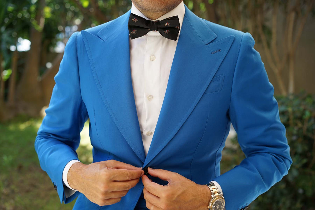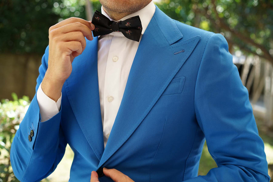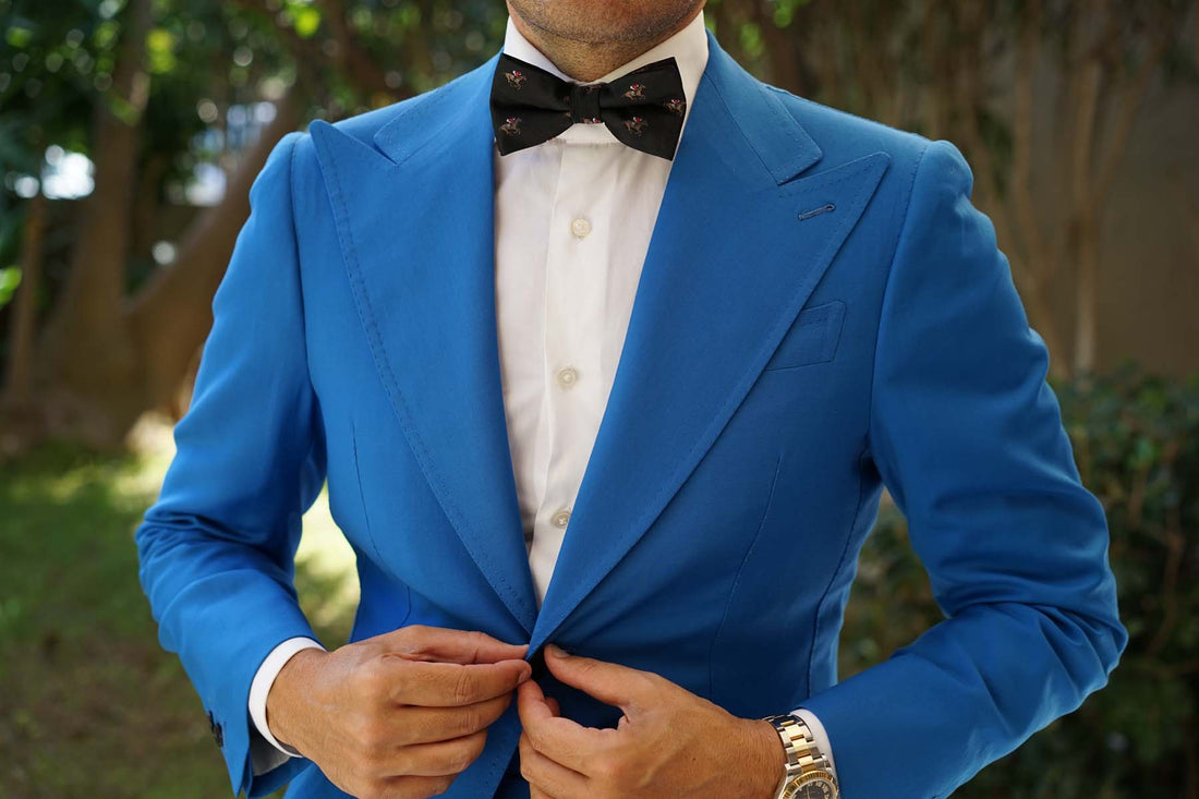 Luxuriously handcrafted from a plush satin fabric, this Black Melbourne Race Horse Bow Tie effortlessly marries high-quality style with enviable comfort. The elegant brown, red and blue features give a superb complement to the sophisticated black base. Subtly textured and superbly detailed by the Brothers at OTAA.