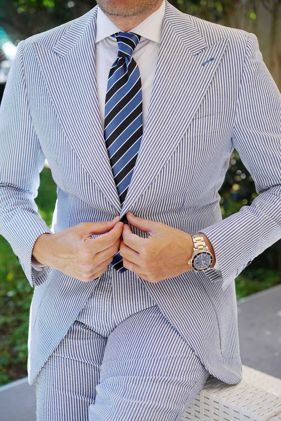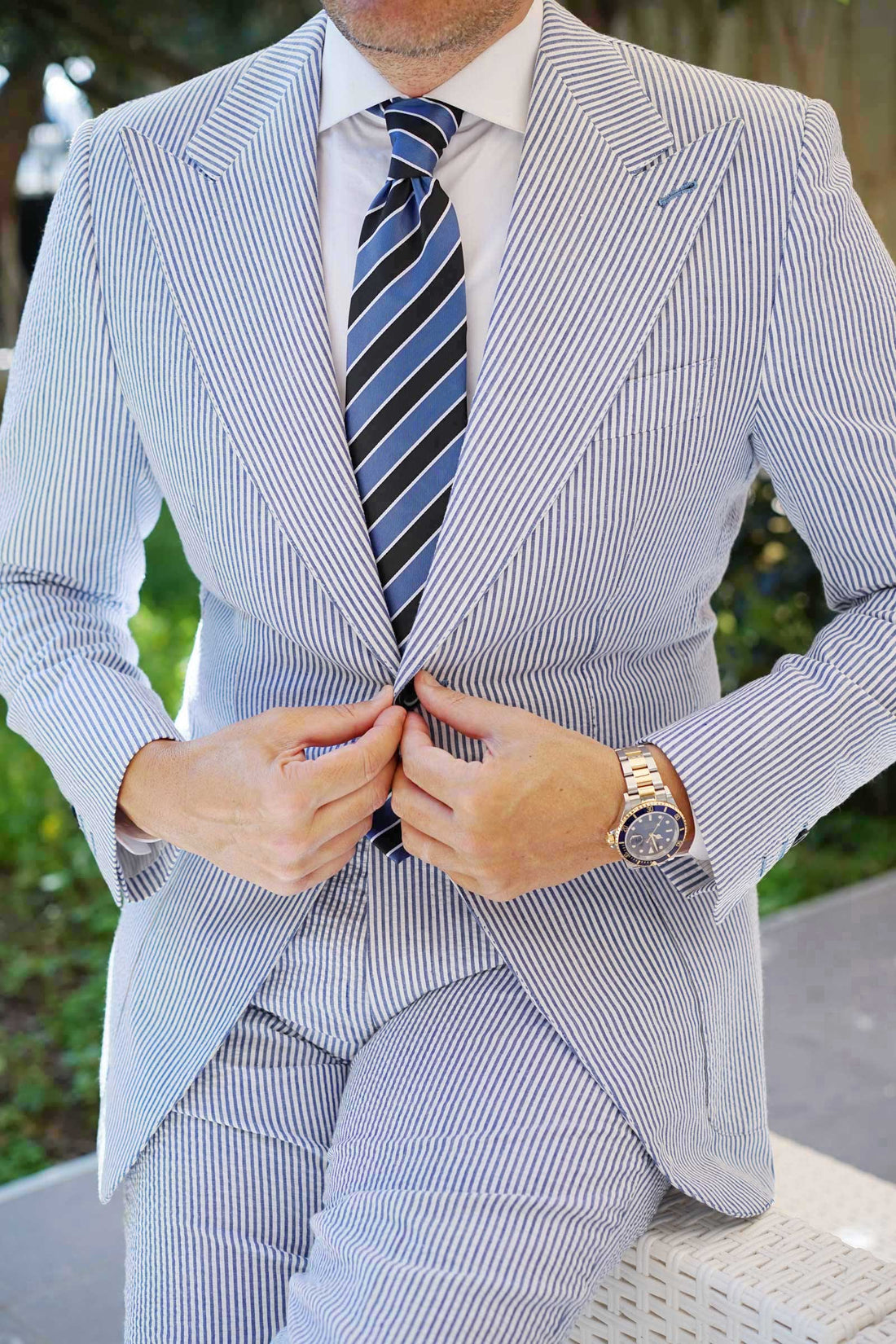 The blue Necktie with black and white stripes creates a bold and classy look. This Necktie pattern is suited to the thin necktie look and ideal for formal and all necktie events.
