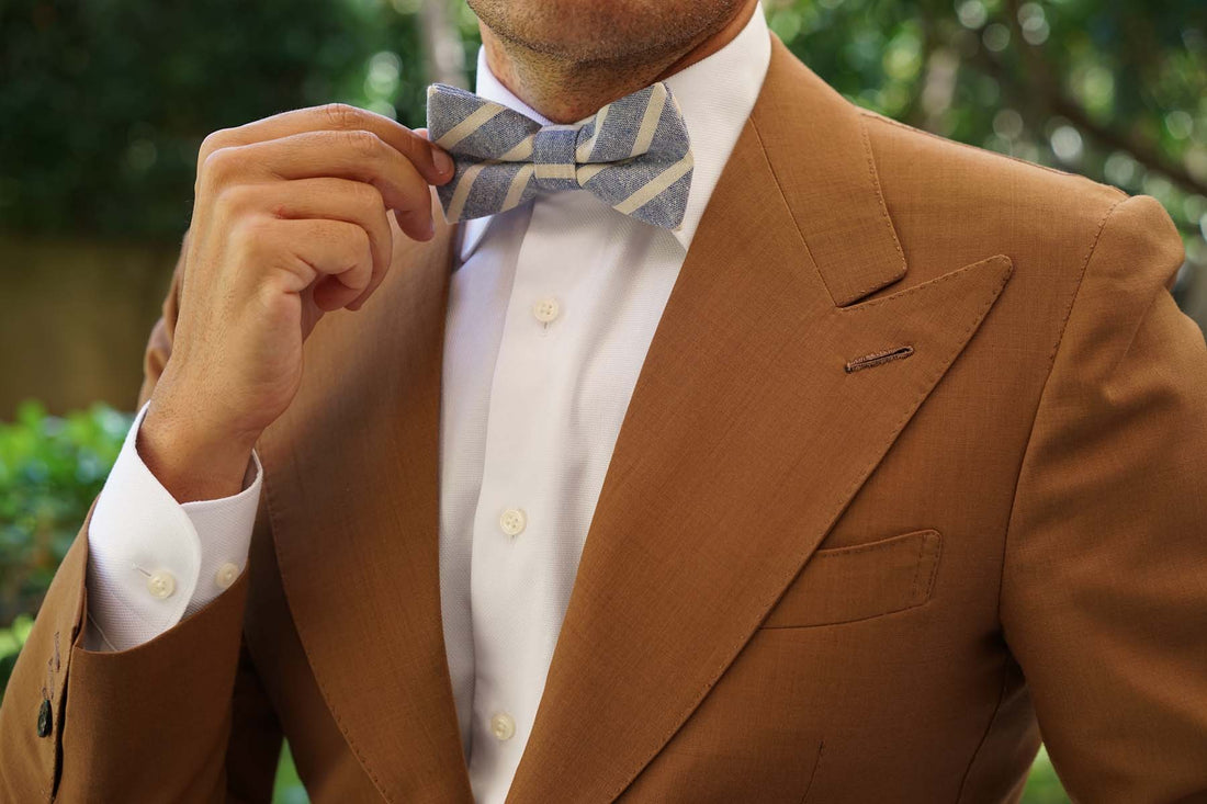 When the Brothers at OTAA create nautical designs, they like to immerse themselves in oceanic environments. The Blue Bodrum Linen Chalk Stripe Bow Tie was designed in the middle of the Atlantic in a haphazard canoe. "Perfect," the brothers professed as they painted their final brushstroke. The canoe capsized and they were forced to ride dolphins to shore- but that's ok because this Blue Bodrum Linen Chalk Stripe Pre-tied Bowtie is a knock-out!