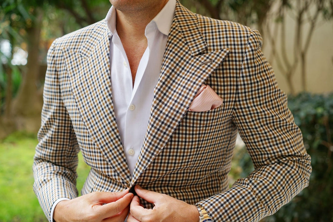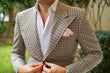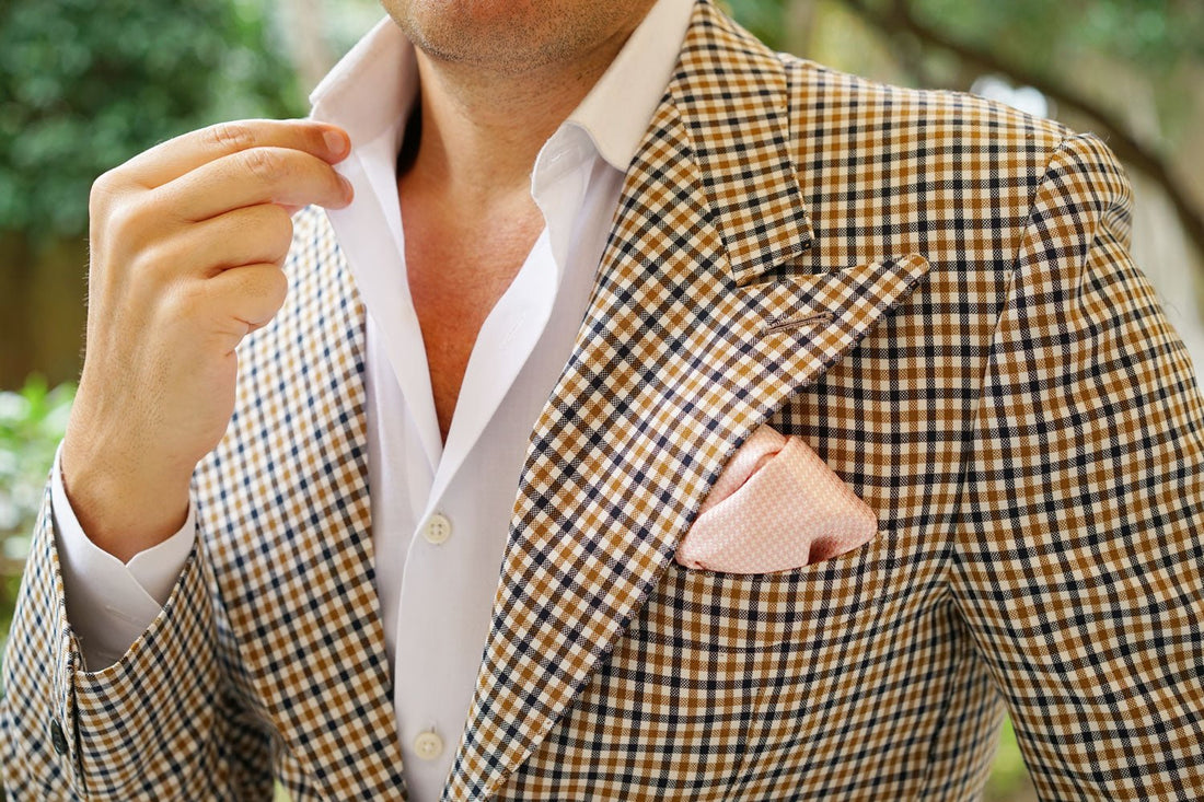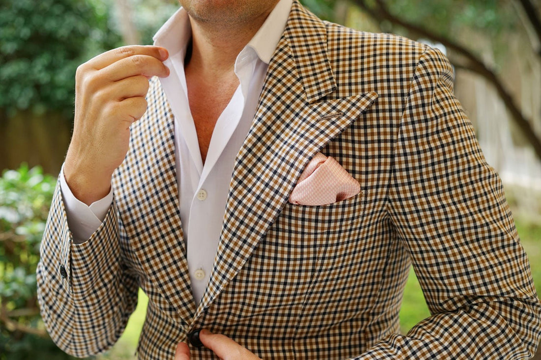 The Blush Pink Houndstooth Pocket Square is a vivacious piece of attire and the perfect fit for a broad range of occasions. The Brothers at OTAA first came across the iconic houndstooth check pattern in the Scottish Lowlands, in search of the Loch Ness monster. Their search for Nessy didn’t yield much success (although the younger brother did spot a fetching marlin), but the sailor on their riverboat had exquisite taste in clothing, offering each of the thread-weaving Brothers the secrets of his houndstooth weave.
