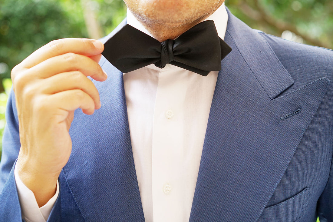 This Bond Black Self Tie Diamond Tip Bow Tie is a testament to simplicity and style. Superbly finessed with a single shade palette, this self tie diamond bowtie demonstrates that refinement doesn't have to be complicated.