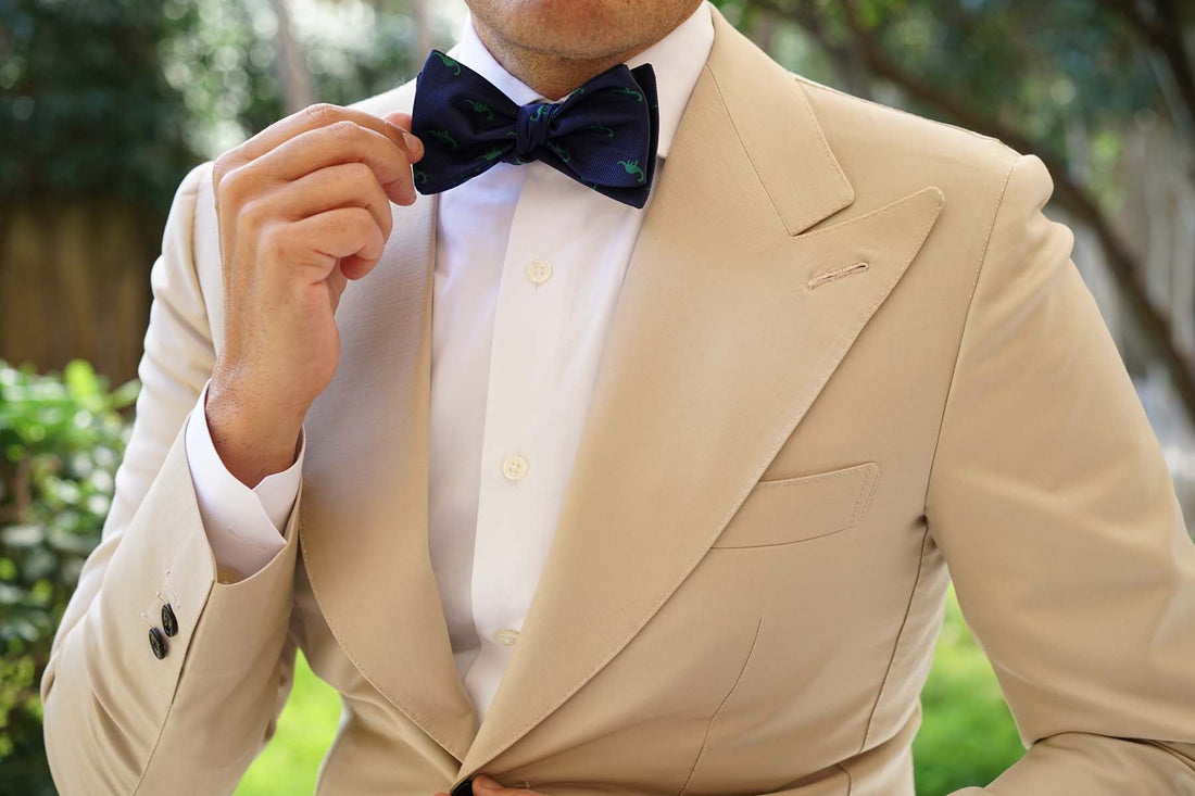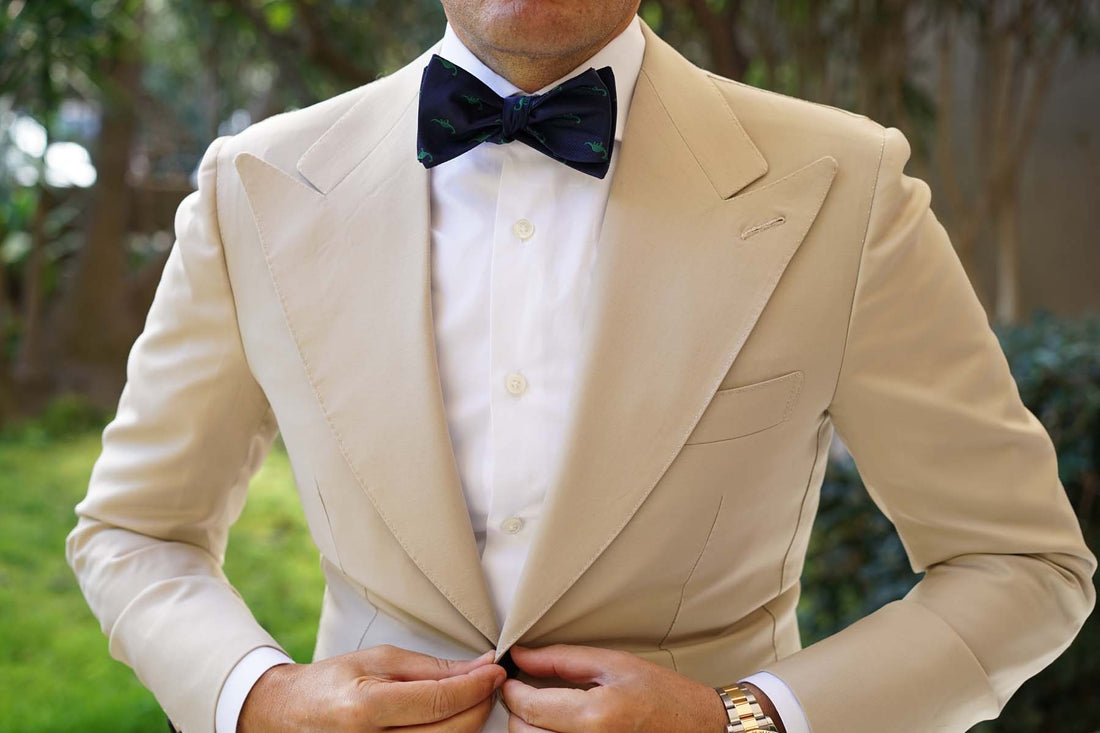 Our hand-sewn method allows the Brontosaurus Dinosaur Self Tie Bowtie to exhibit extraordinary detail as there is little machinery used in the crafting of this tie. Touches such as these make all the difference. Inspired by this lovable Brontosaurus Dinosaur that we saw in the flesh (this definitely happened), our Brontosaurus Dinosaur Self Bow Tie exudes sophistication and is hand cut and sewn with on a classic navy backing. Designed exclusively by The Brothers at OTAA.