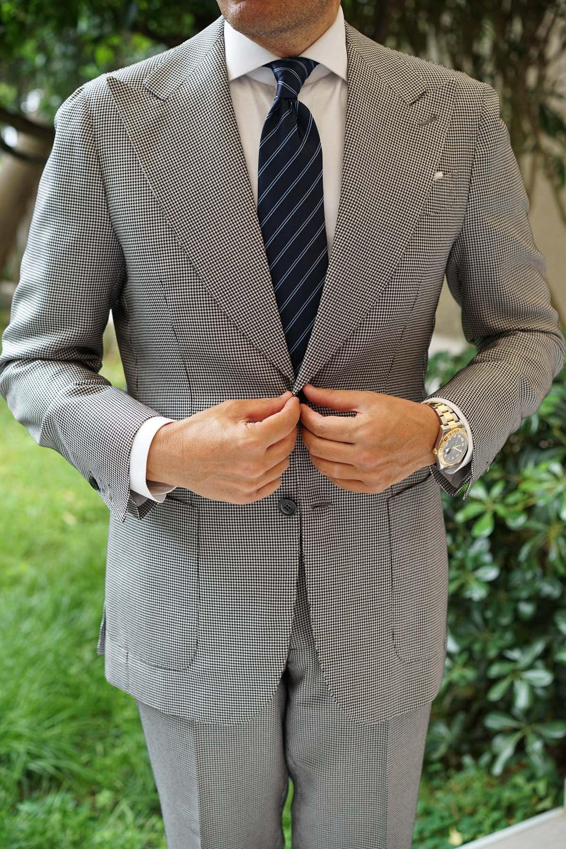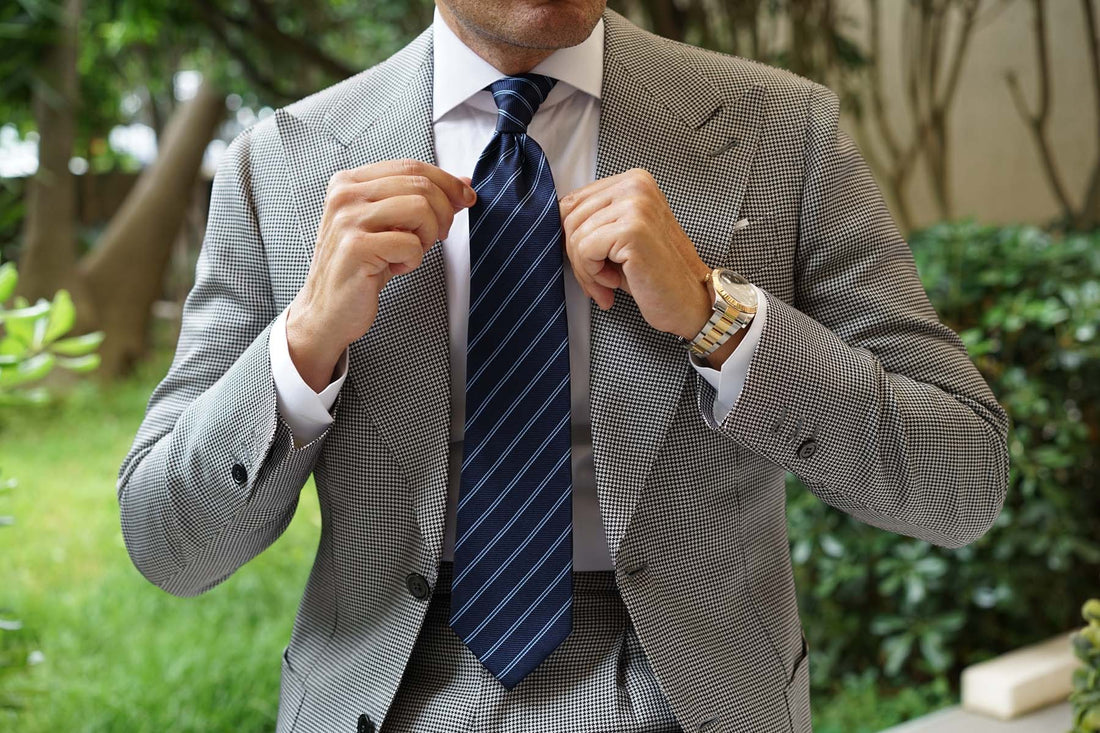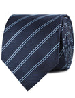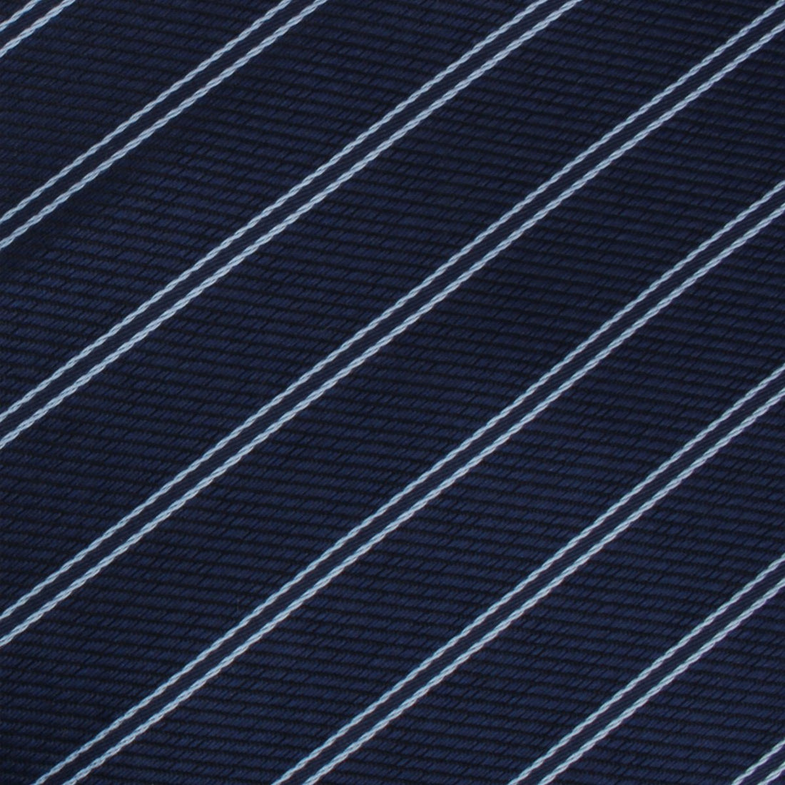 The Brooklyn Navy Blue Necktie gives a humble accent of functional elegance. Two sky blue streaks run diagonally across the body of the necktie like the wake of a sailboat on the surface of the ocean, captured in birds-eye view at the end of an action film as the heroes make off with the treasure.