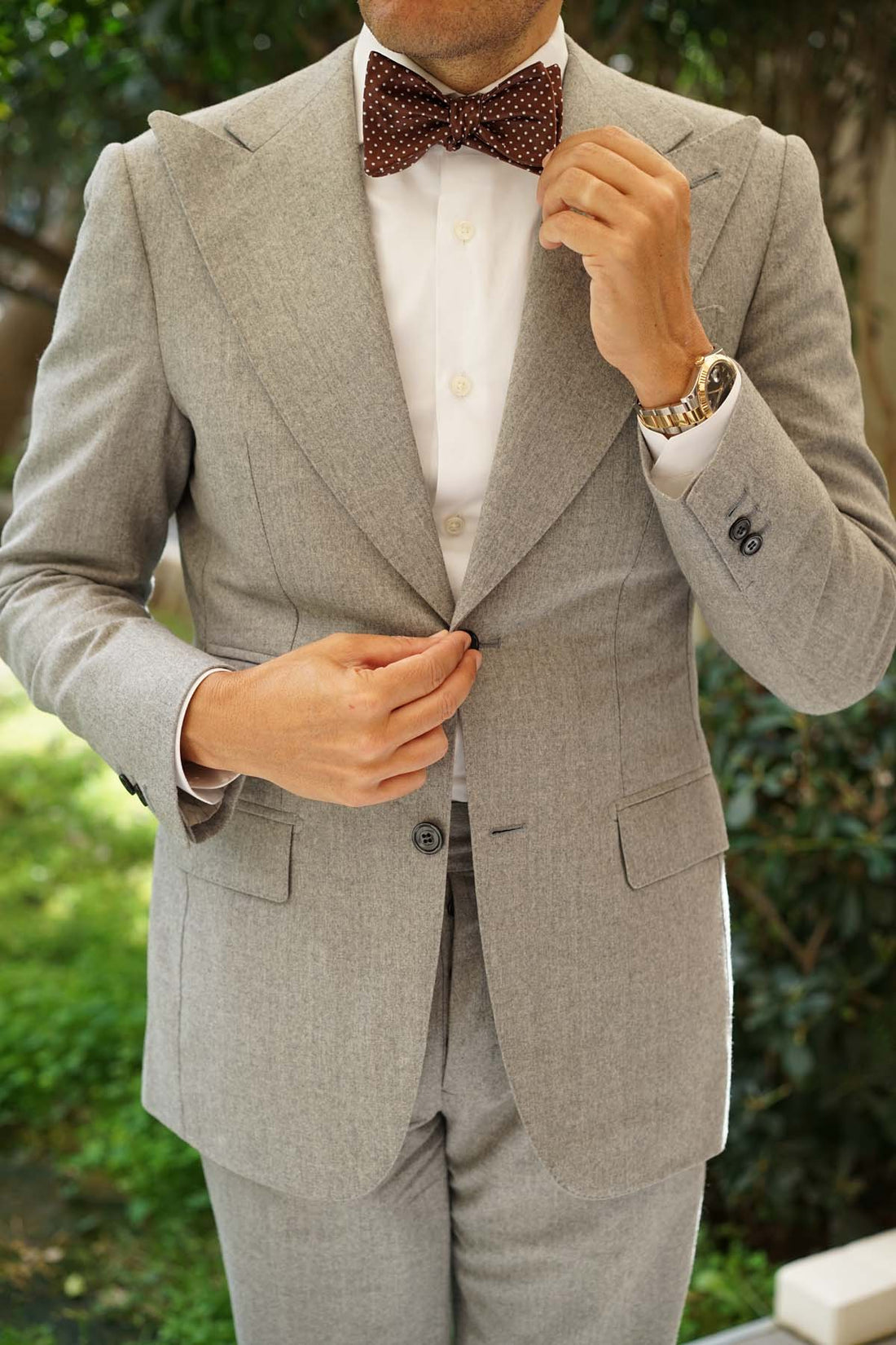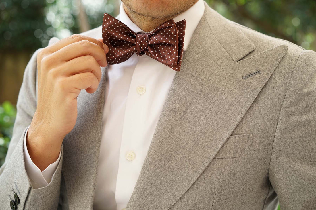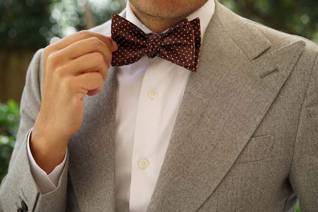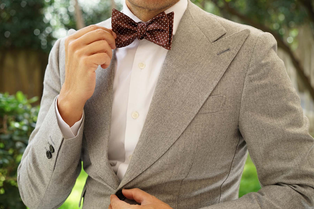 Detailed and luxurious, this Brown Mini Polka Dots Self Tie Bow Tie is a faultless staple. A classic polka dot bow tie is a wardrobe must-have, and this Brown Mini Polka Dots Untied Bow Tie is an exquisite contender. Elegantly handcrafted from a fine satin cloth, this self tie bow tie offers a smooth surface and a subtle lustre finish. The vintage chocolate hues are superbly complemented by artisanal white polka dots for a stylish outlook. Wear this Brown Mini Polka Dots Self Tie Bow Tie to add a flourishing accent to formal styles. Designed exclusively by the Brothers at OTAA.